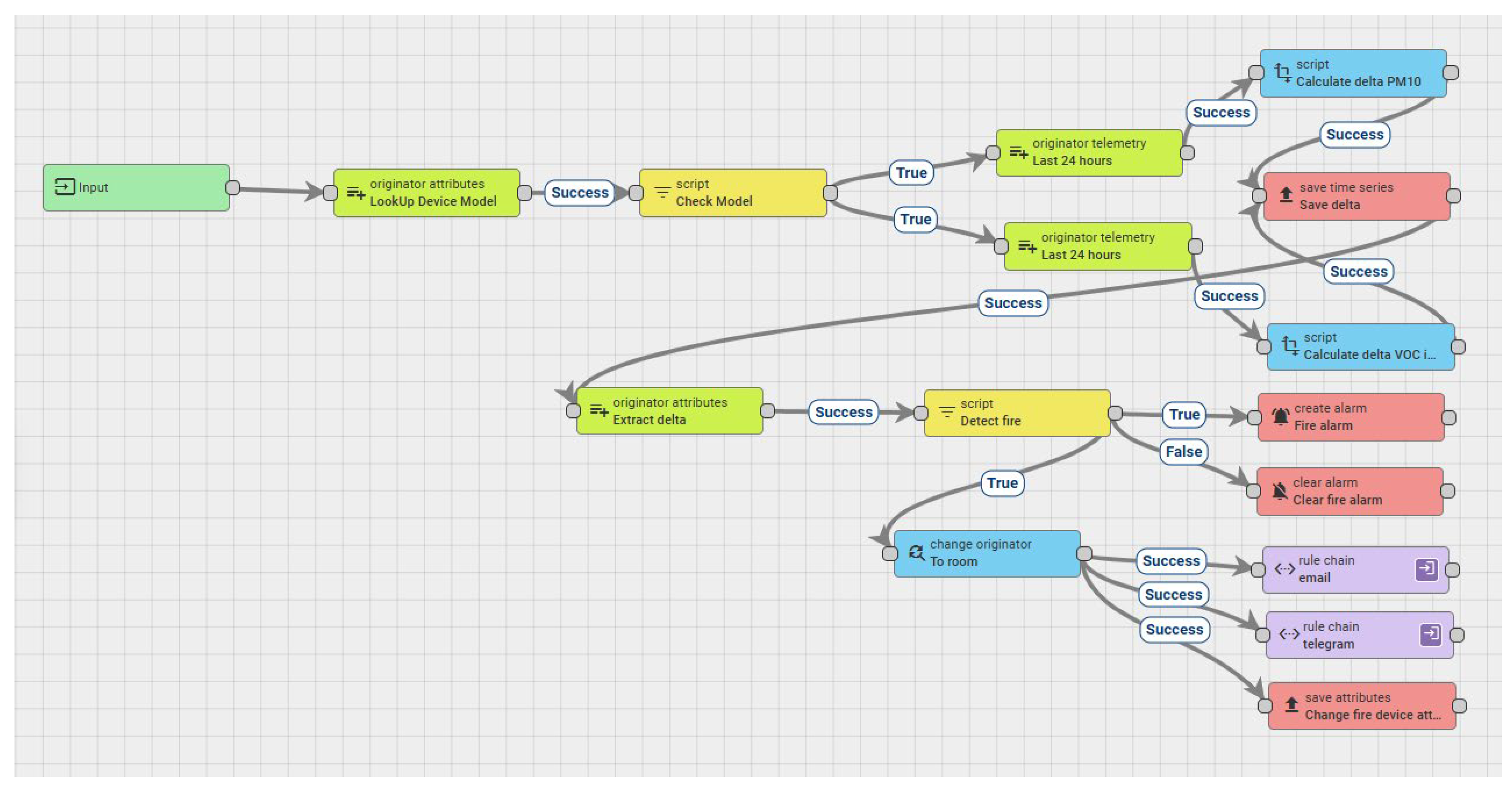 | Our study | Own air quality monitoring sensors based on NodeMCU ESP8266 and SEN55—low cost and easy to deploy as proven in [17] | VOCs NOx PM1.0, PM2.5, PM4.0,and PM10 temperature and humidity sensor | Sensor fusion—multiple trigger conditions | WiFi | ThingsBoard IoT Cloud Platform | Yes/can be used to organize the intervention of firefighters | Yes—email, mobile phone alarm, web Platform |