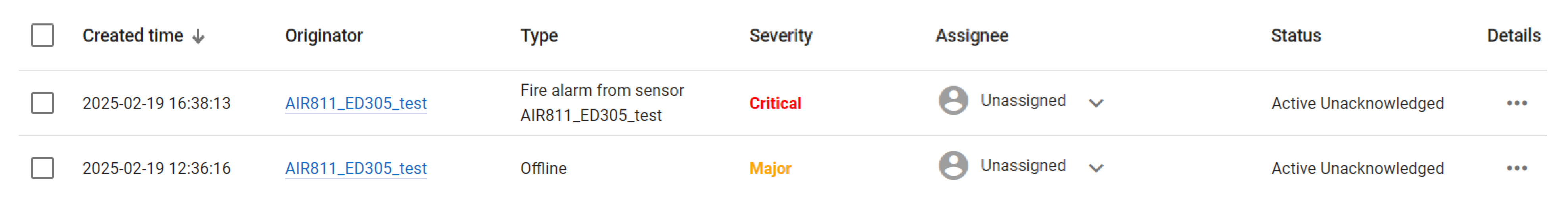 - An alarm is generated at the ThingsBoard platform level (Figure 13). This alarm is visible at the platform level and can be managed in a complex manner by assigning it to the person in charge, associating the event description, and tracking the resolution. This alarm has the role of alerting the people responsible for monitoring the building.