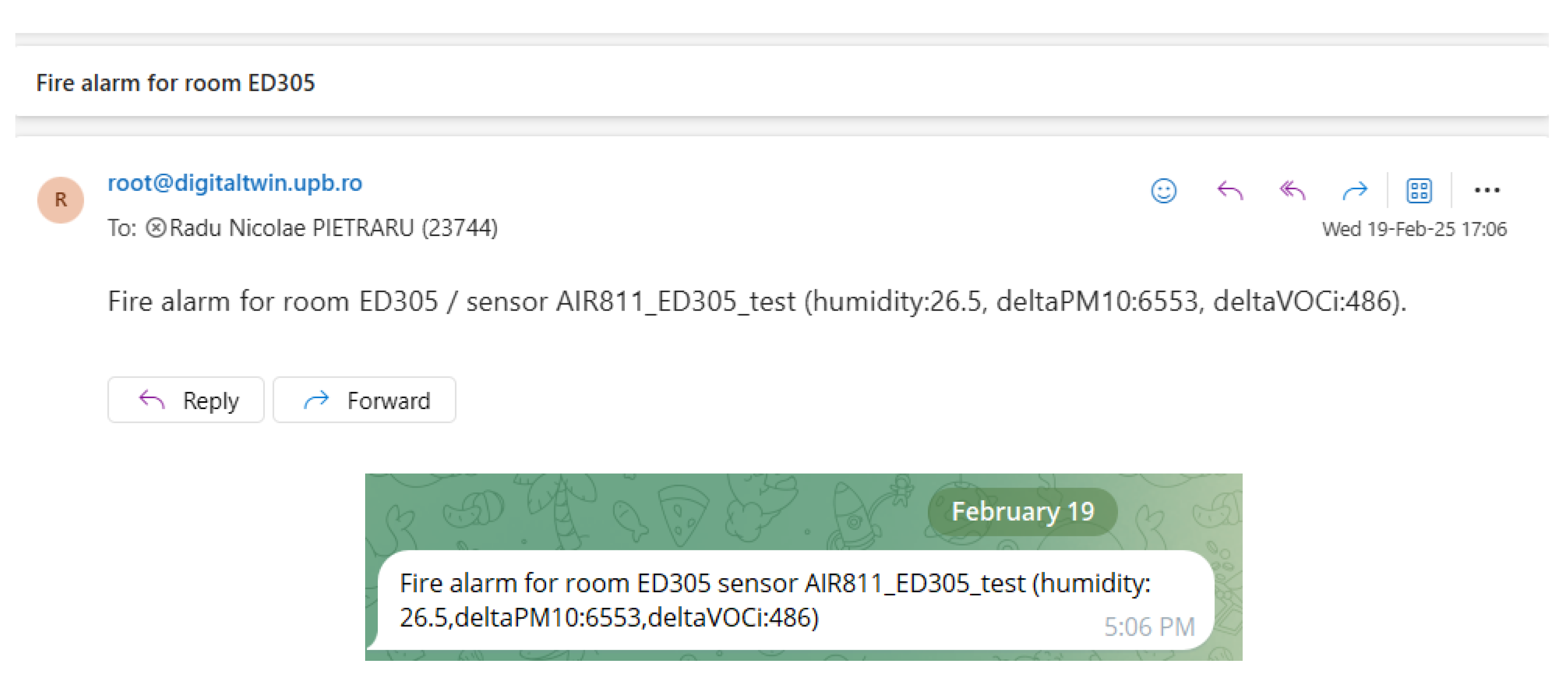 - Notifications are sent to the person in charge of the laboratory in which the alarm was triggered. At the ThingsBoard platform level, the IoT sensors belong to specific rooms, and each room has a defined person in charge. In the current implementation, alarms are sent via email and the Telegram platform (Figure 14), but the ThingsBoard platform also allows the implementation of alarms via SMS or at the ThingsBoard mobile application level. These alarms have the role of alerting the local people in charge.