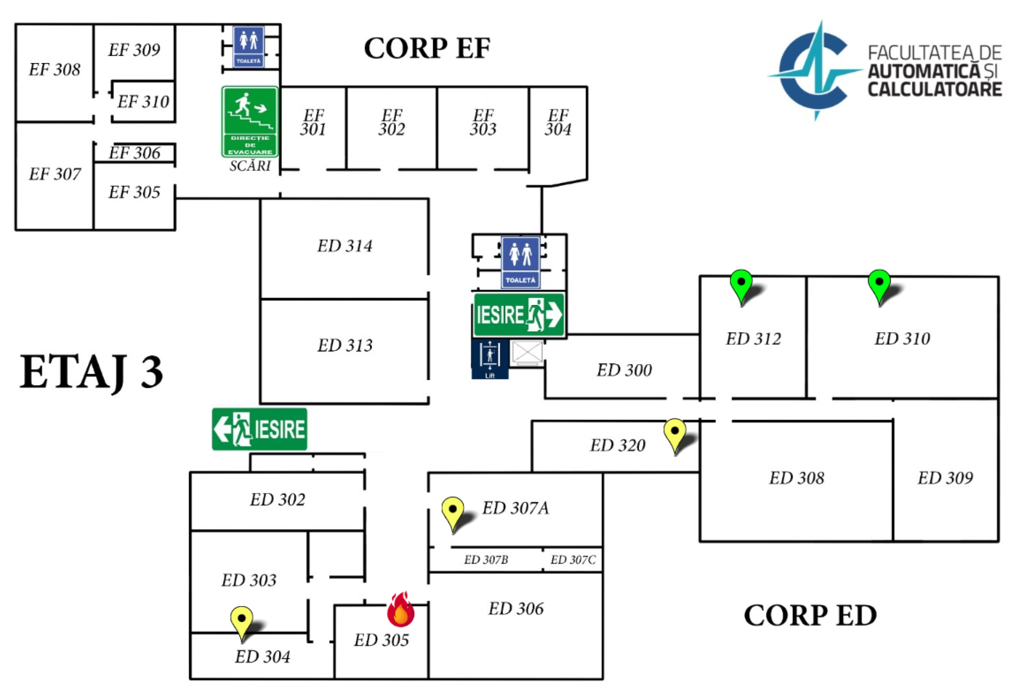- Activate the sound and light alarms on the hardware devices by changing the alarm state. The alarm hardware devices are IoT devices consisting of a NodeMCU development board, a siren, and a flash LED bar. These devices periodically check the status of a server parameter via WiFi and, depending on this, have an on or off status. These devices have the role of alarming the people in the immediate vicinity of the area where the fire was detected.