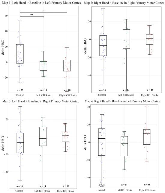 Figure 4 explains group-level comparisons of control, left, and right ICH stroke. In map 1 (Left Hand > Baseline in left priMC), control differed significantly from both left-hemispheric ICH (p < 0.01, d = 0.86, large) and right-hemispheric ICH (p < 0.01, d = 0.87, large), while no significant difference was observed between left- and right-hemispheric ICH (p = 0.84, d = 0.07, negligible).