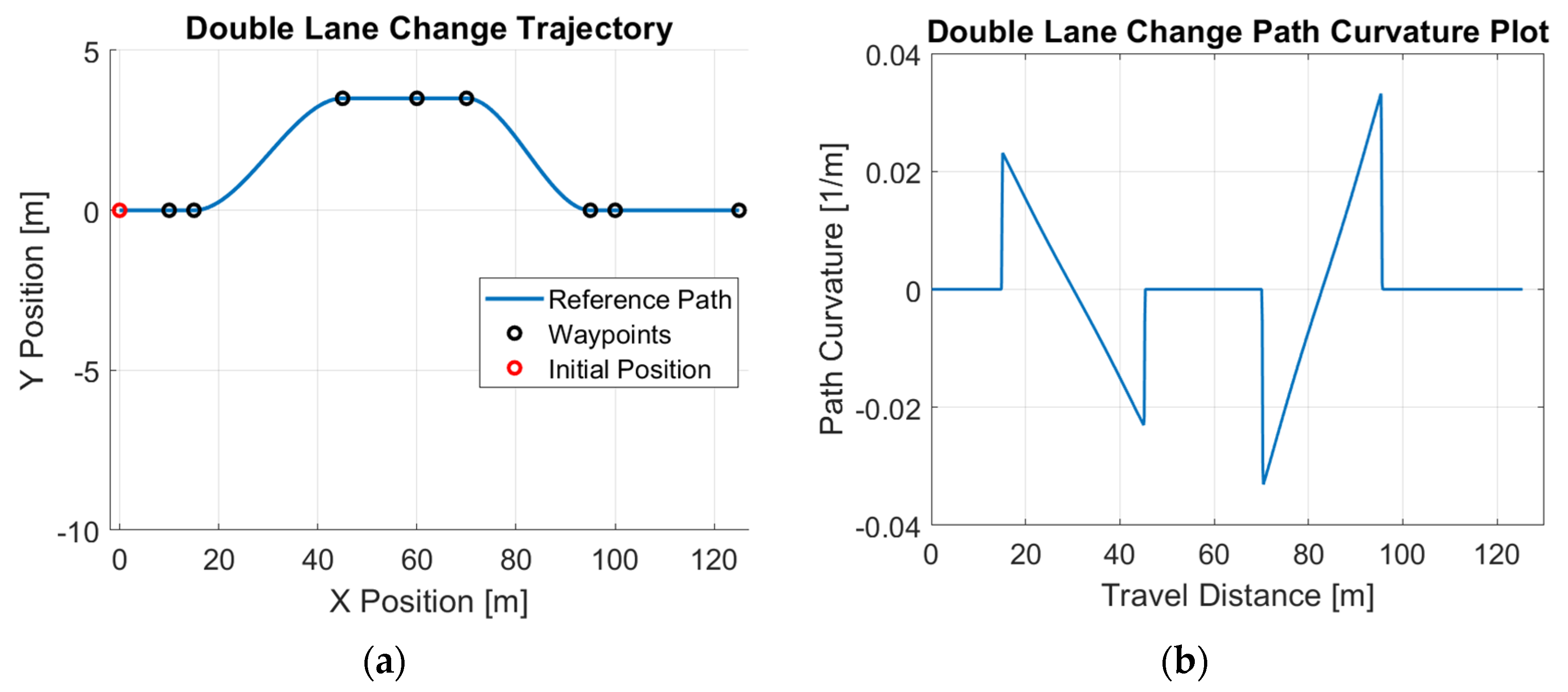 28]. Through extensive observations, we find that real vehicles frequently perform lane-change maneuvers while driving as examples of path tracking. To reflect this behavior, we designed two commonly used lane-change patterns: a single-lane-change maneuver and a double-lane-change maneuver. Both patterns were incorporated into the path generation process to create realistic reference trajectories, enabling more comprehensive evaluation of the controller’s performance under typical driving scenarios.
