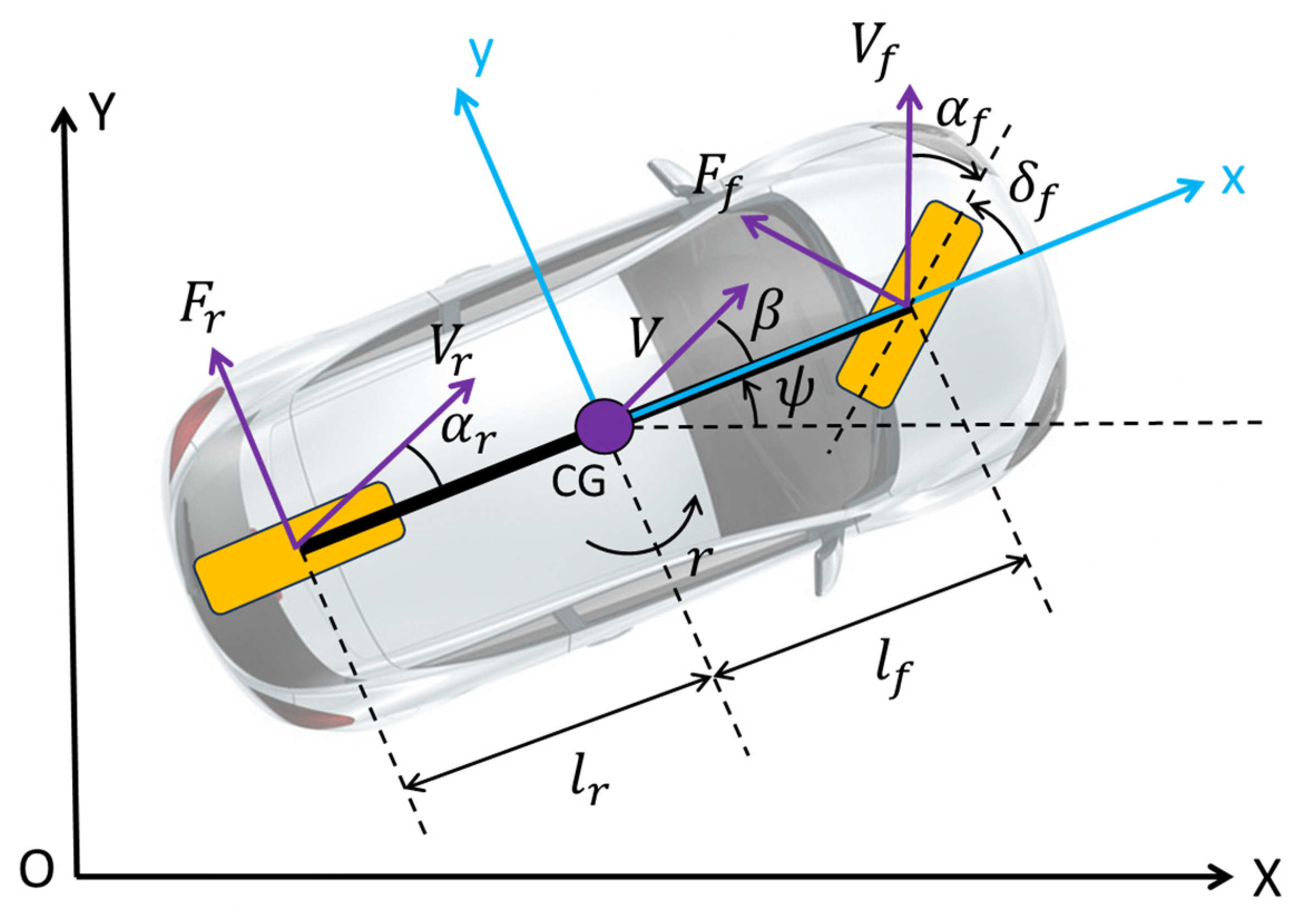 38]. This linear path-tracking model contains two components: a linear lateral single-track model and a path-tracking model augmentation. The plane’s lateral motion of this single-track vehicle is illustrated in