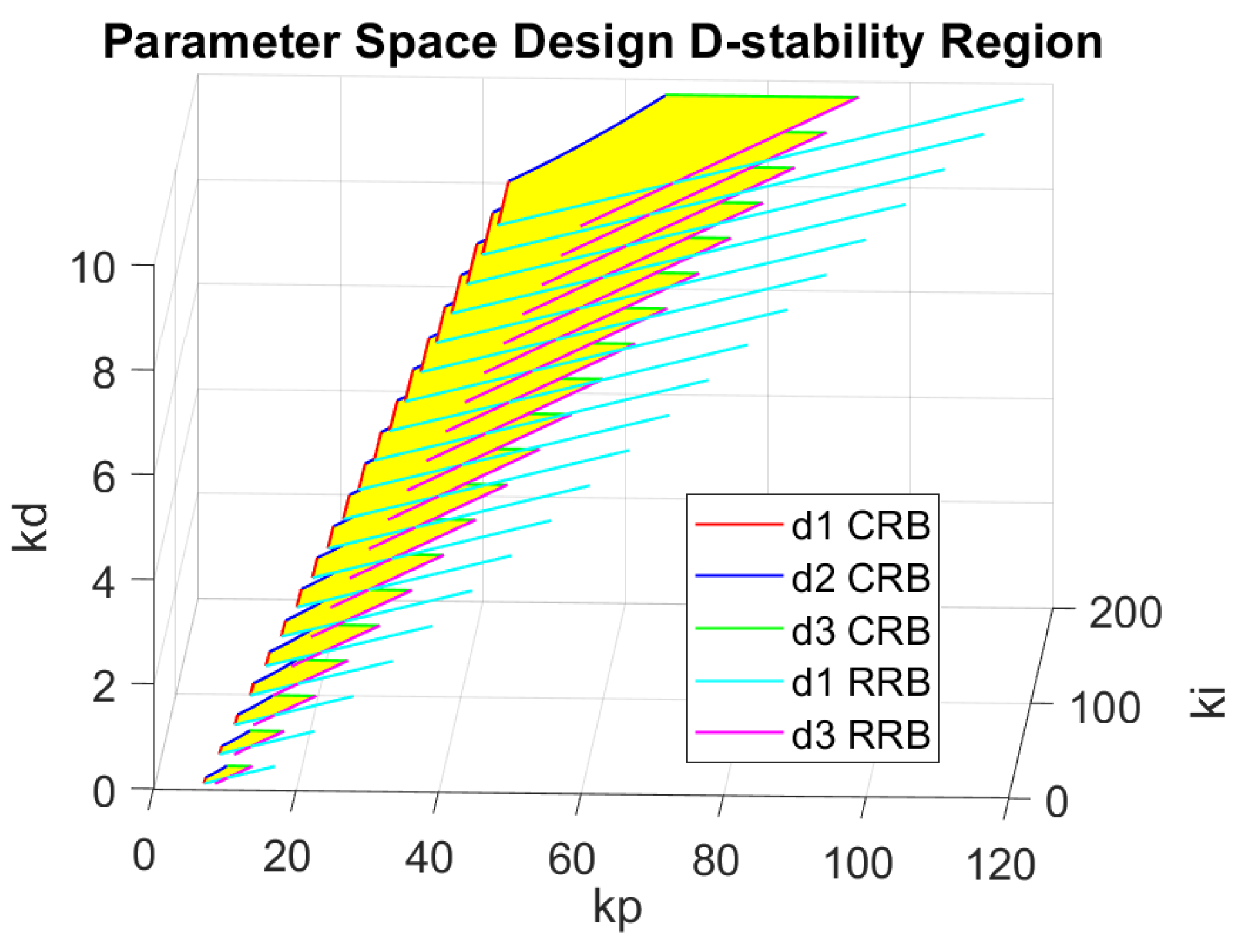 controller gain values, respectively. It should be remarked that during the process of controller gain value selection, a general rule of thumb is to choose the gains to be as small as possible within the admissible region so that the control effort can be minimized. In practice, any point within the 3-D yellow region can be selected, as all such choices guarantee D-stability and therefore ensure both performance and robustness. In this work, we selected