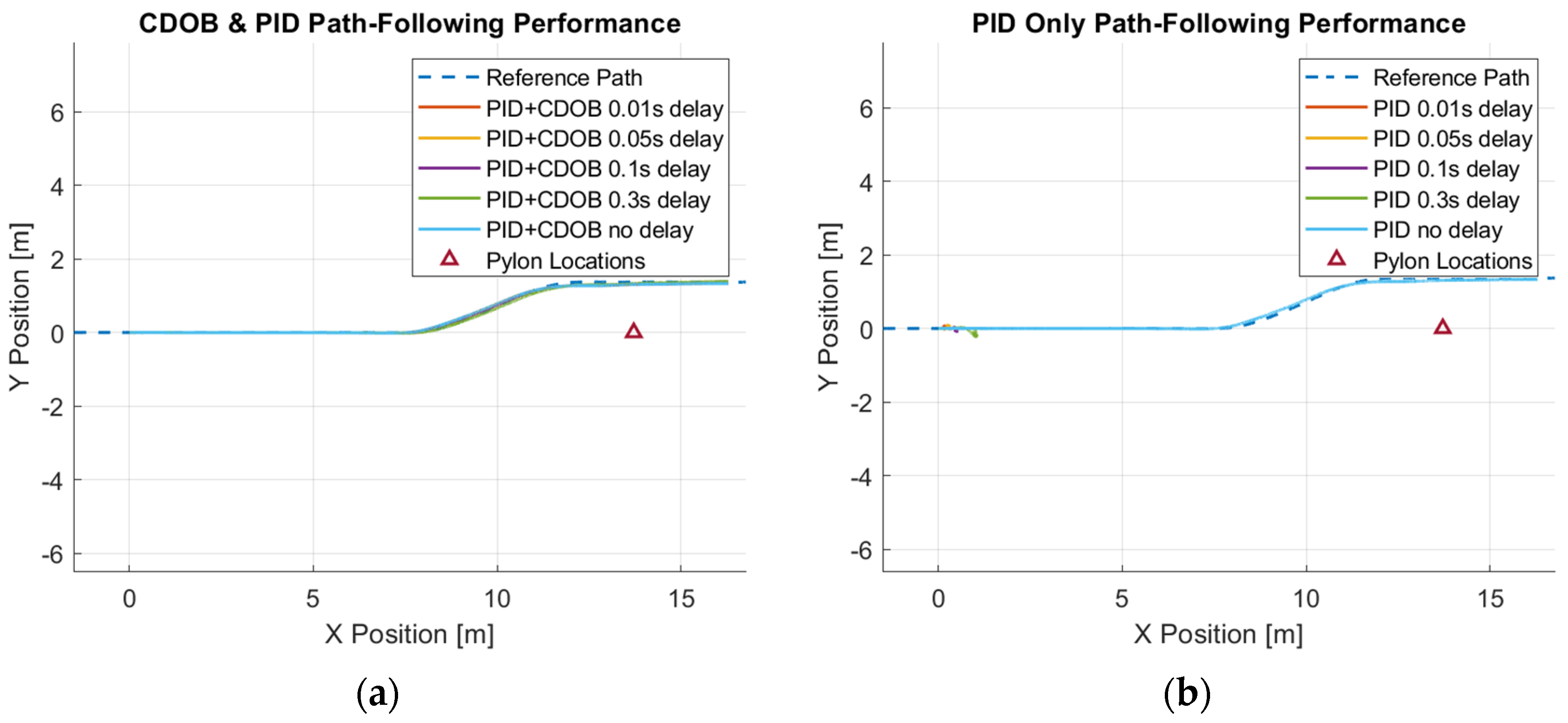 Figure 16, the CDOB+PID controller accurately follows the reference trajectory across all tested delay levels, with only minimal deviations even at a 0.3 s delay. In contrast, the PID-only controller again suffers from time delays and cannot successfully track the reference path.