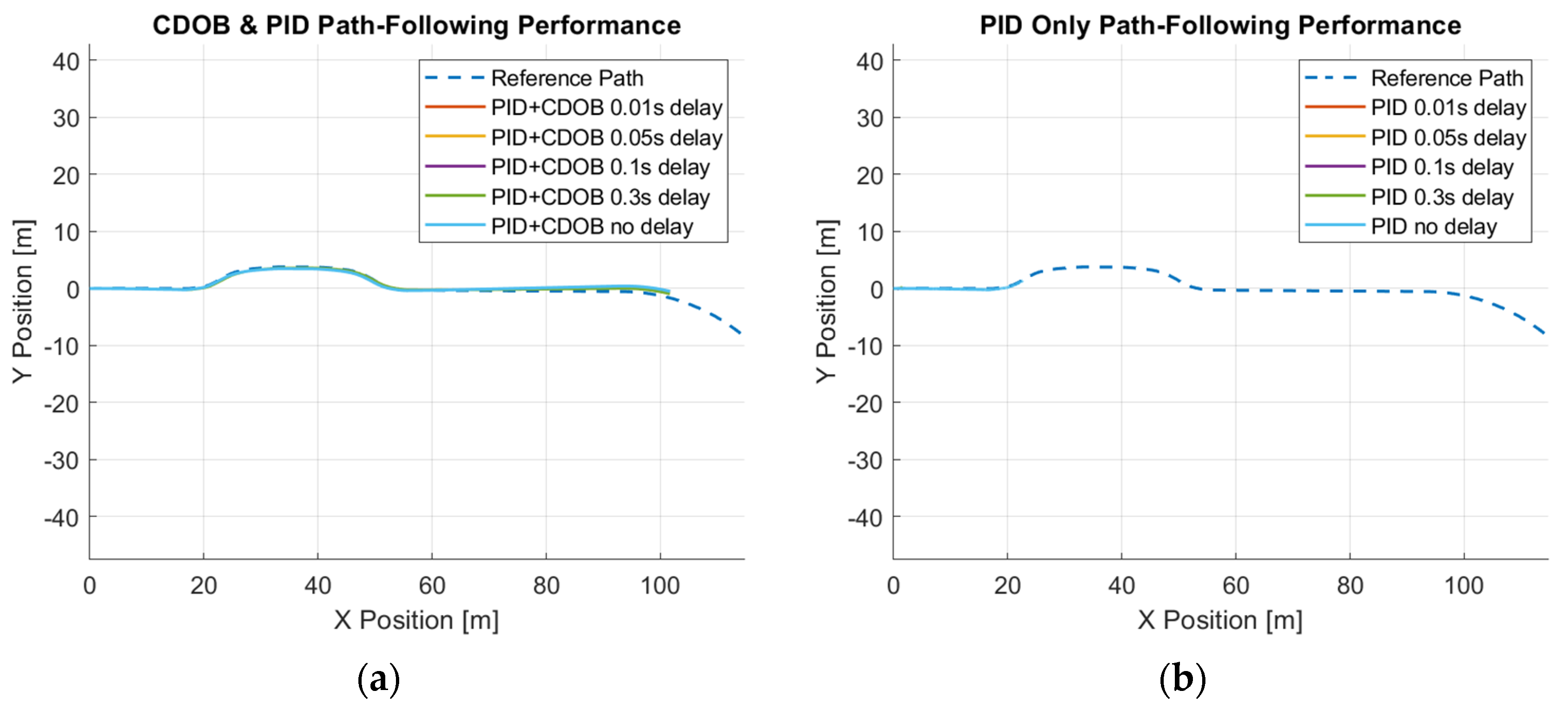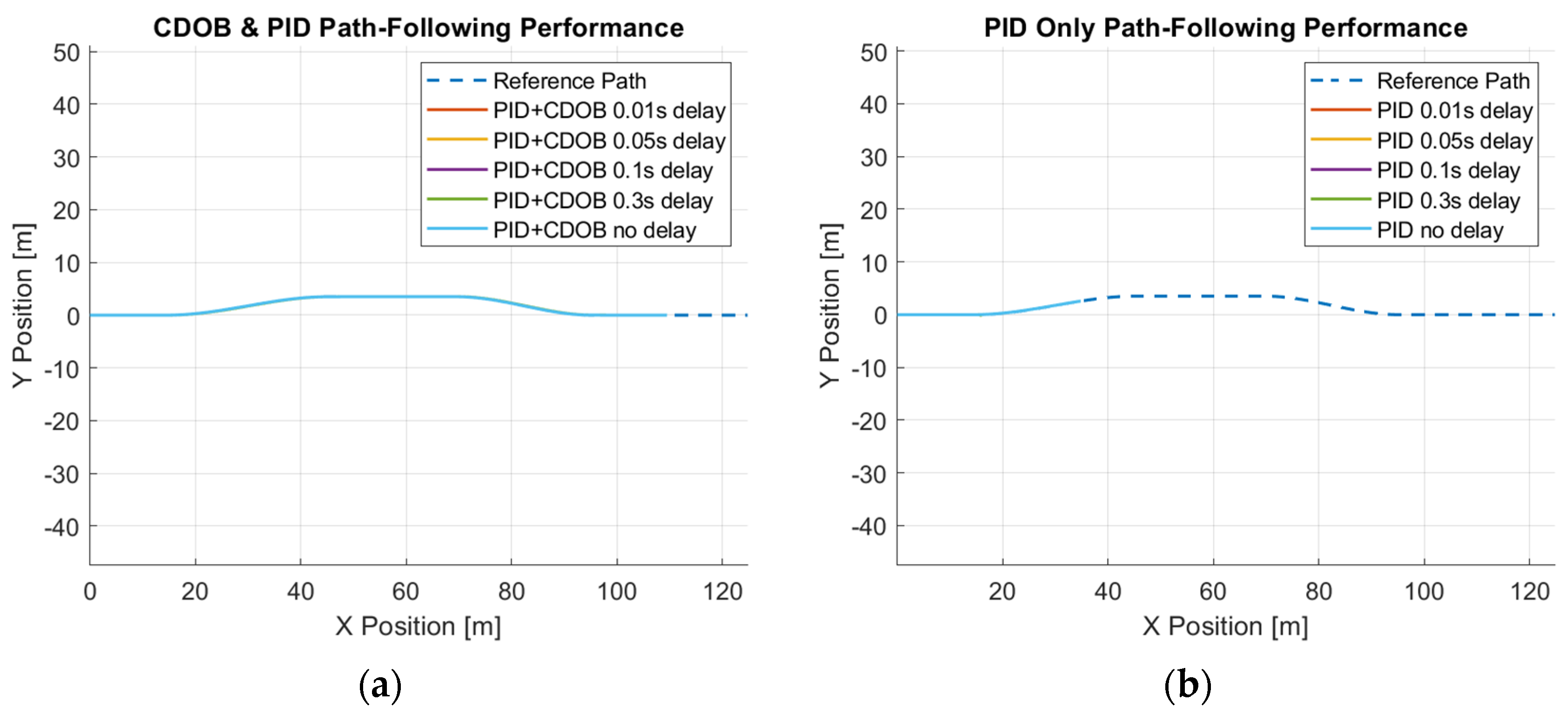 36] have been explored to ensure accurate and reliable path tracking. While these conventional control theories may perform well in simulation environments, their performance often deteriorates when implemented on real vehicles. This is largely due to the discrepancies between the vehicle model and the actual vehicle dynamics and the presence of inevitable communication delays and computation delays in connected autonomous vehicle (CAV) systems. Such delays can lead to degraded tracking accuracy, oscillatory responses, or even instability, especially when vehicles operate under dynamic and uncertain traffic conditions. Traditional control strategies, such as Proportional–Integral–Derivative (PID) controllers or standard disturbance observer (DOB) approaches, often struggle to maintain high tracking performance under these delay conditions. Therefore, there is a pressing need for an effective and delay-tolerant control method that can ensure precise path tracking and robust stability even when undesirable time delays are present. To address this challenge, this study proposes a communication disturbance observer (CDOB)-based delay-tolerant control framework that compensates for the adverse effects of time delays. In this framework, time delay is considered as a special kind of disturbance and CDOB is utilized to estimate and compensate for this delay-induced disturbance, which can effectively restore the system’s behavior to its delay-free equivalent. After the CDOB compensates for the delay, conventional robust control theories can be directly applied to achieve robust and accurate path tracking, even in the presence of unknown and varying delays. In this paper, parameter-space-based PID control is used as tracking controller with CDOB since it exhibits good robustness and tracking performance under delay-free conditions.