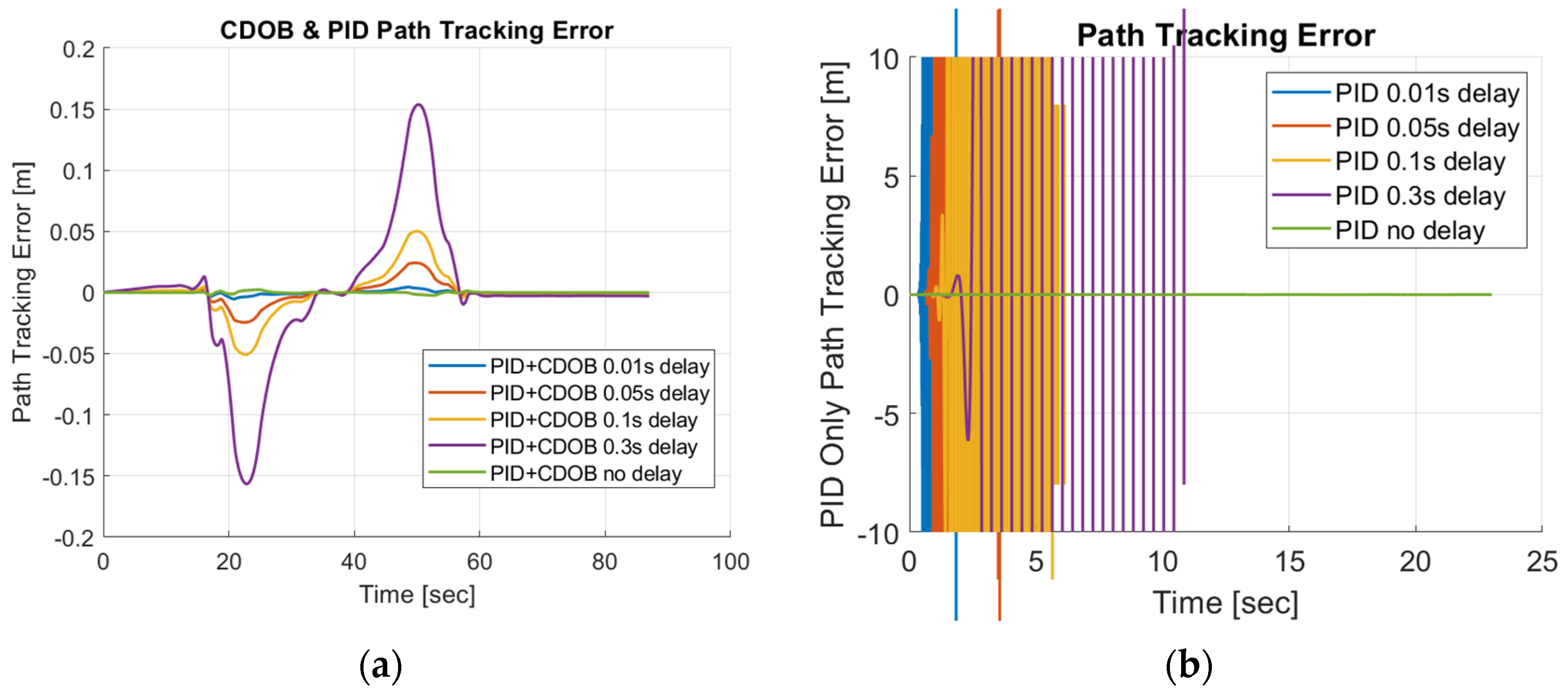 Figure 13a shows that the PID+CDOB system can follow the path with relatively small error even though error values increase with increases in time delay. The PID-only results in