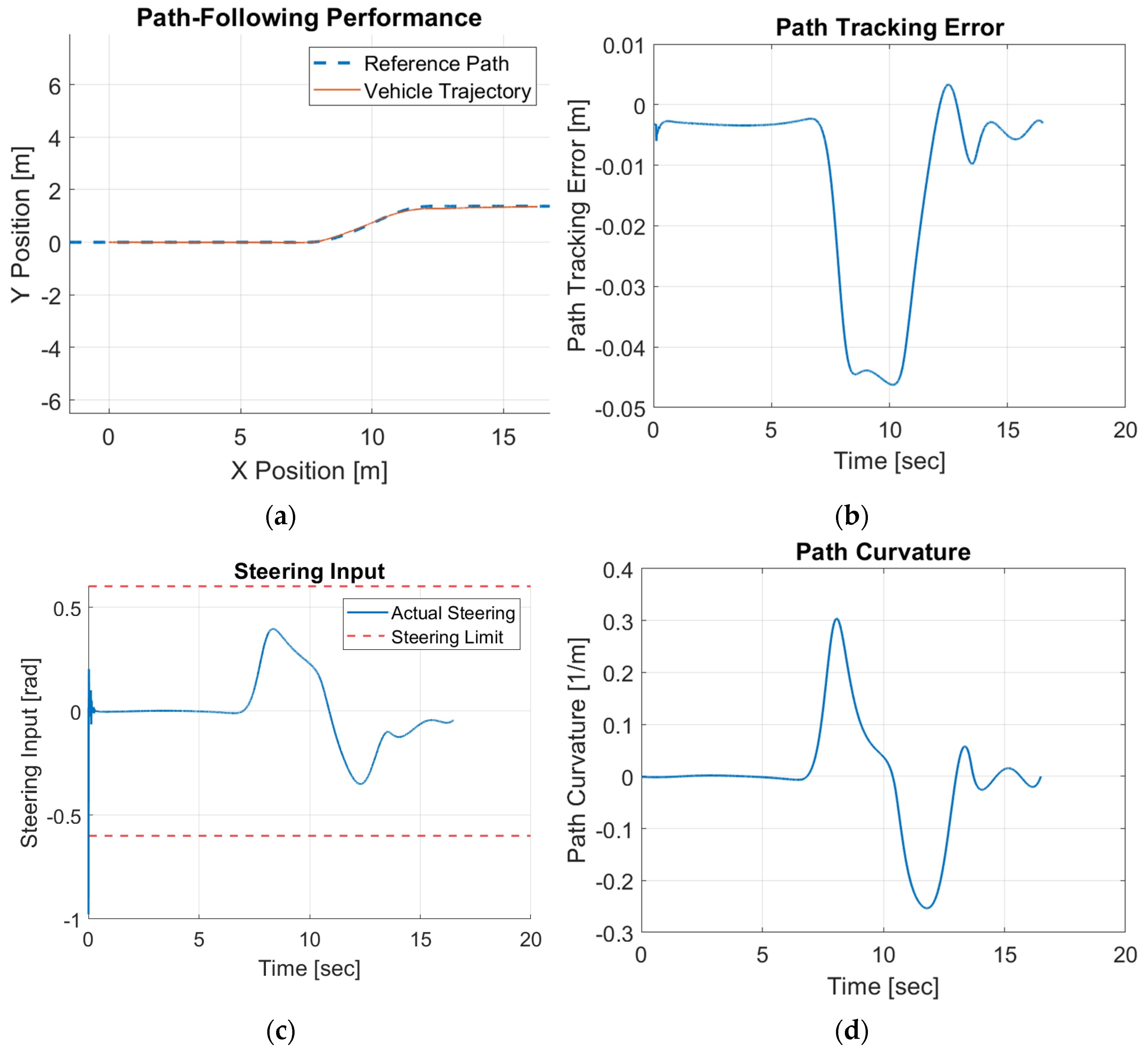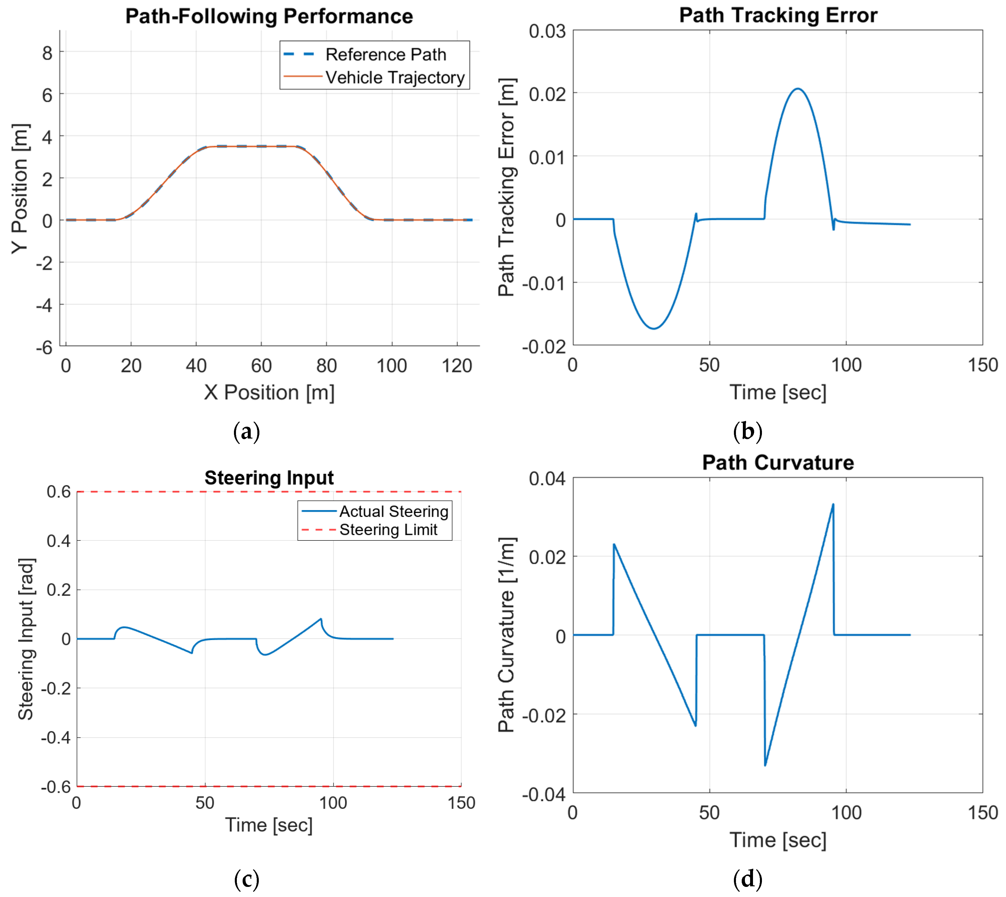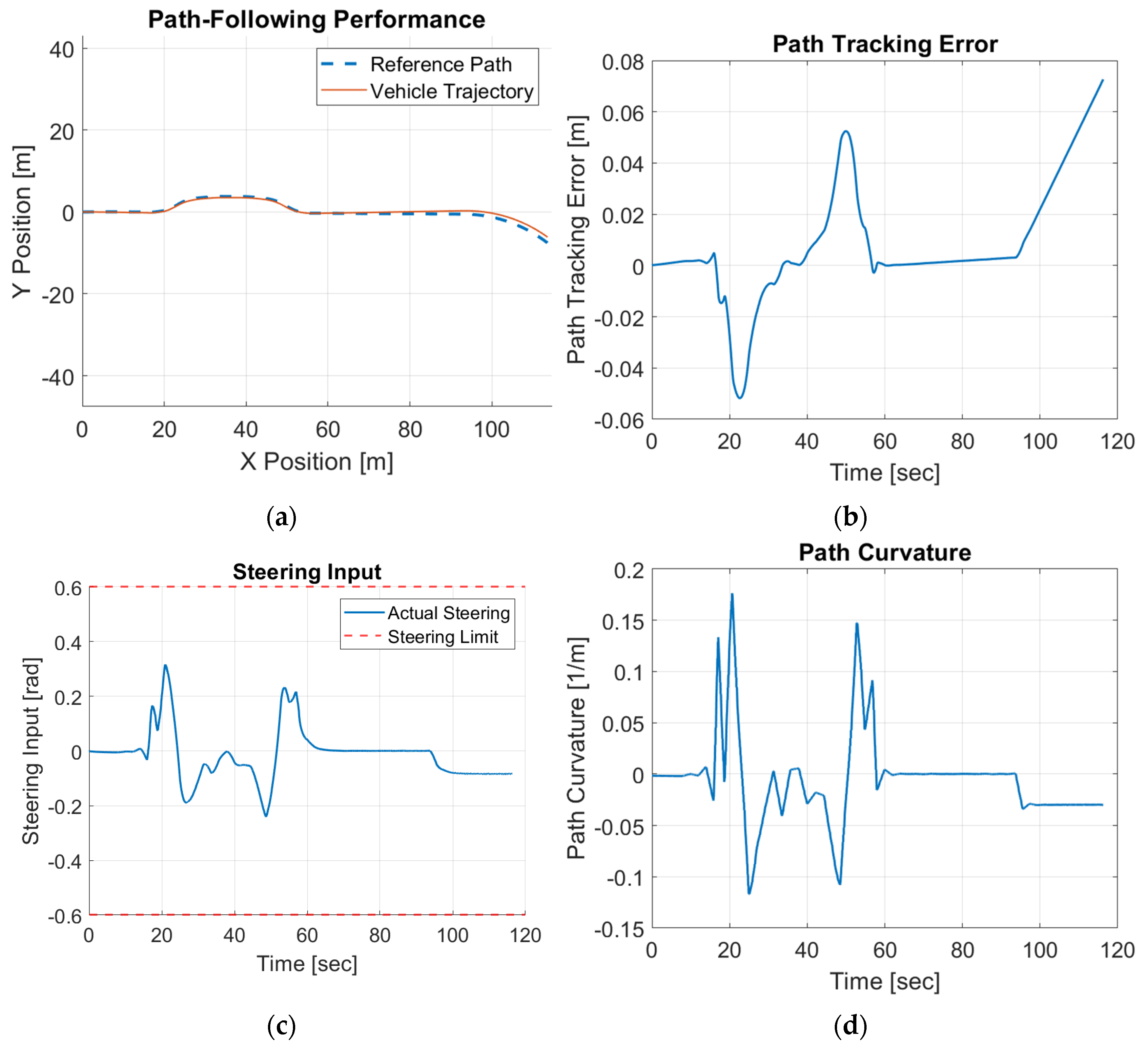 The path-tracking error remains within ±0.02 m, indicating precise and stable path tracking. It can also be observed that the large path-tracking error often occurs during the curved sections of the trajectory, where sudden changes in path curvature lead to more aggressive control inputs, resulting in larger tracking errors. The steering input profile stays smooth and well within the saturation limits, suggesting that the controller generates stable and feasible commands.
