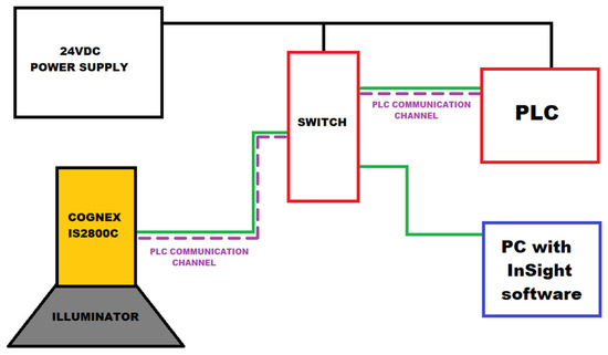 Figure 3 represents not a conceptual model but the fully implemented experimental platform, consisting of the Cognex smart camera, Compact GuardLogix PLC, In-Sight software version 24.4.1 on a PC, and a custom 3D-printed fixture, all interconnected via an Ethernet/IP switch and powered by a 24 VDC source. This architecture was designed to replicate realistic industrial deployment conditions, ensuring the validity of the obtained results.