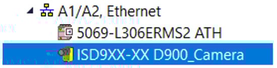 The process of configuring the camera connection to a PLC in an Ethernet/IP network begins with adding the appropriate EDS (Electronic Data Sheet) file. After adding the EDS file definition, the vision camera must be integrated into the project. For this, the camera’s IP address and communication protocol must be known. Once the Cognex camera is added to the program, it is registered by being included in the device list, as shown in the figure below (Figure 4).