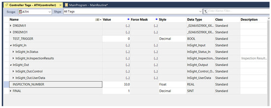 When basic communication had been established, as indicated by the absence of a warning symbol next to the camera model in Studio 5000 software version 32.01.00, the development of the Ladder Diagram program was initiated. The program was responsible for reading the relevant camera registers and handling communication frames. Using the Ethernet/IP protocol, the process was largely automated and required minimal programming effort. Controller tags used for communication with the Cognex system were generated almost entirely automatically by importing a preconfigured package provided by Cognex for Allen-Bradley systems. Prior to this, matching tags had been defined in Studio 5000 with parameters identical to those used in the vision system (a 32-bit REAL variable and an 8-bit INTEGER datatype). Additionally, a BOOL variable named TEST_TRIGGER had been defined to simulate a sensor detecting the inspected part by forcing the variable’s state. This information is presented in Figure 5.