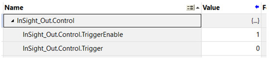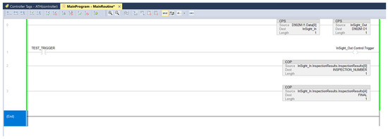 After the relevant tags had been prepared and the program package imported, the development of the logic program in Ladder Diagram was initiated. The CPS and COP blocks located in lines 0, 2, and 3 (Figure 6) were used to move the corresponding variables in binary format. Line 1 contained the InSight_Out.Control.Trigger output, which was used to trigger the camera on a rising edge.