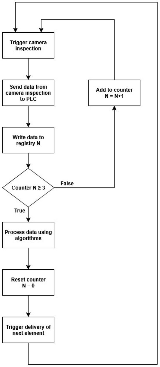 To further improve system reliability, a triple verification algorithm was implemented directly at the PLC level. In this approach, inspection results from three consecutive vision cycles are buffered and then re-evaluated by PLC logic. The algorithm determines the final classification (OK/NOK) based on majority voting and adjustable thresholds, reducing the occurrence of false positives. Additionally, the operator can dynamically modify tolerance limits or switch product types via the HMI interface. The workflow of this PLC-based verification process is presented in Figure 8.