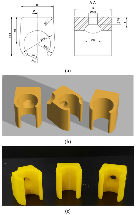 Electrical cable holders: (a) technical drawing; (b) 3D model; (c) printed components.