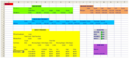 To test the correct operation of the camera and its communication with the PLC, a basic program with a traditional approach (Cognex Spreadsheet) was prepared to detect the presence of a hole and to detect material defects. Then, the data was transmitted using Cognex In-Sight functions such as FormatOutputBuffer and WriteResultsBuffer. An example of the vision-based inspection program is shown in Figure 10.