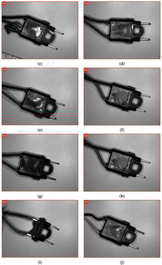 Electrical connectors: (a) correct part; (b) no element; (c) broken insulation; (d) deformed; (e) partial molding; (f) deformation; (g) misaligned pins; (h) excess material; (i) partial molding, bent pins; (j) dent.