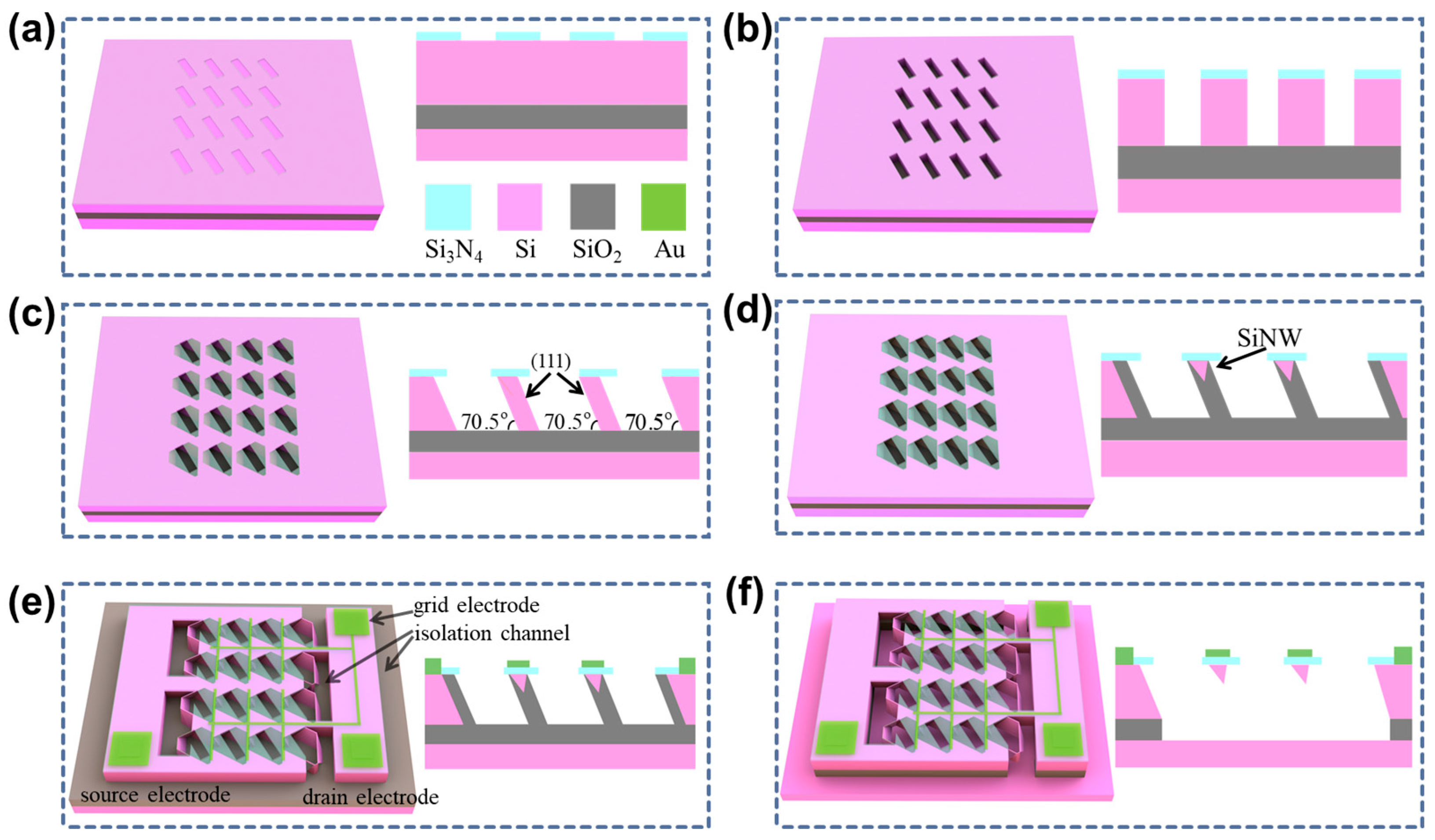 - Yang, X.; Gao, A.R.; Wang, Y.L.; Li, T. Wafer-level and highly controllable fabricated silicon nanowire transistor arrays on (111) silicon-on-insulator (SOI) wafers for highly sensitive detection in liquid and gaseous environments. Nano Res. 2018, 11, 1520–1529. [Google Scholar] [CrossRef]