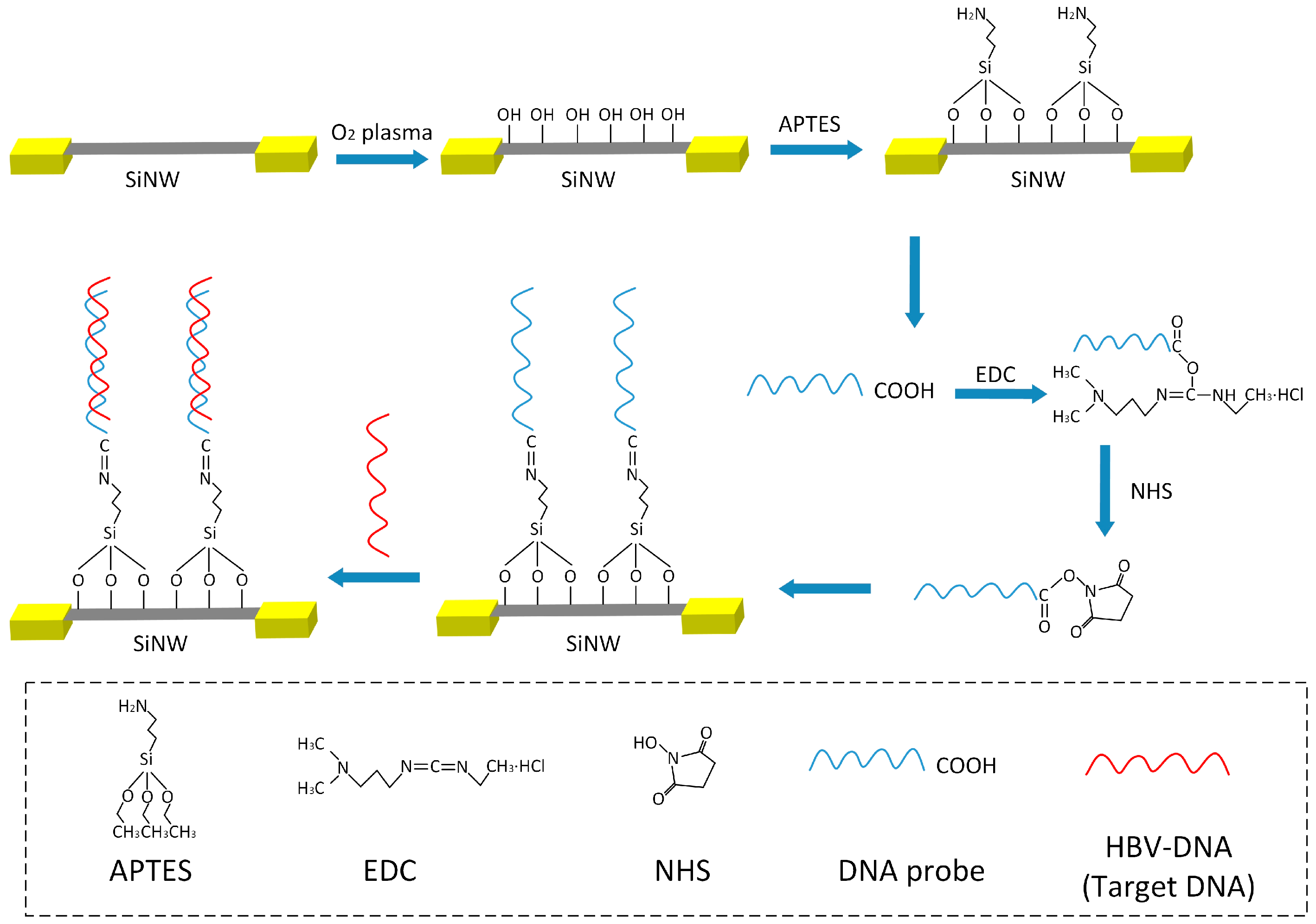 Sun, P.; Liu, M.; Zhang, Y.; Liu, C.; Yang, X. A Highly Sensitive Silicon Nanowire Array Field Effect Transistor Biosensor for Detecting HBV-DNA and AFP. Sensors 2025, 25, 6385. https://doi.org/10.3390/s25206385