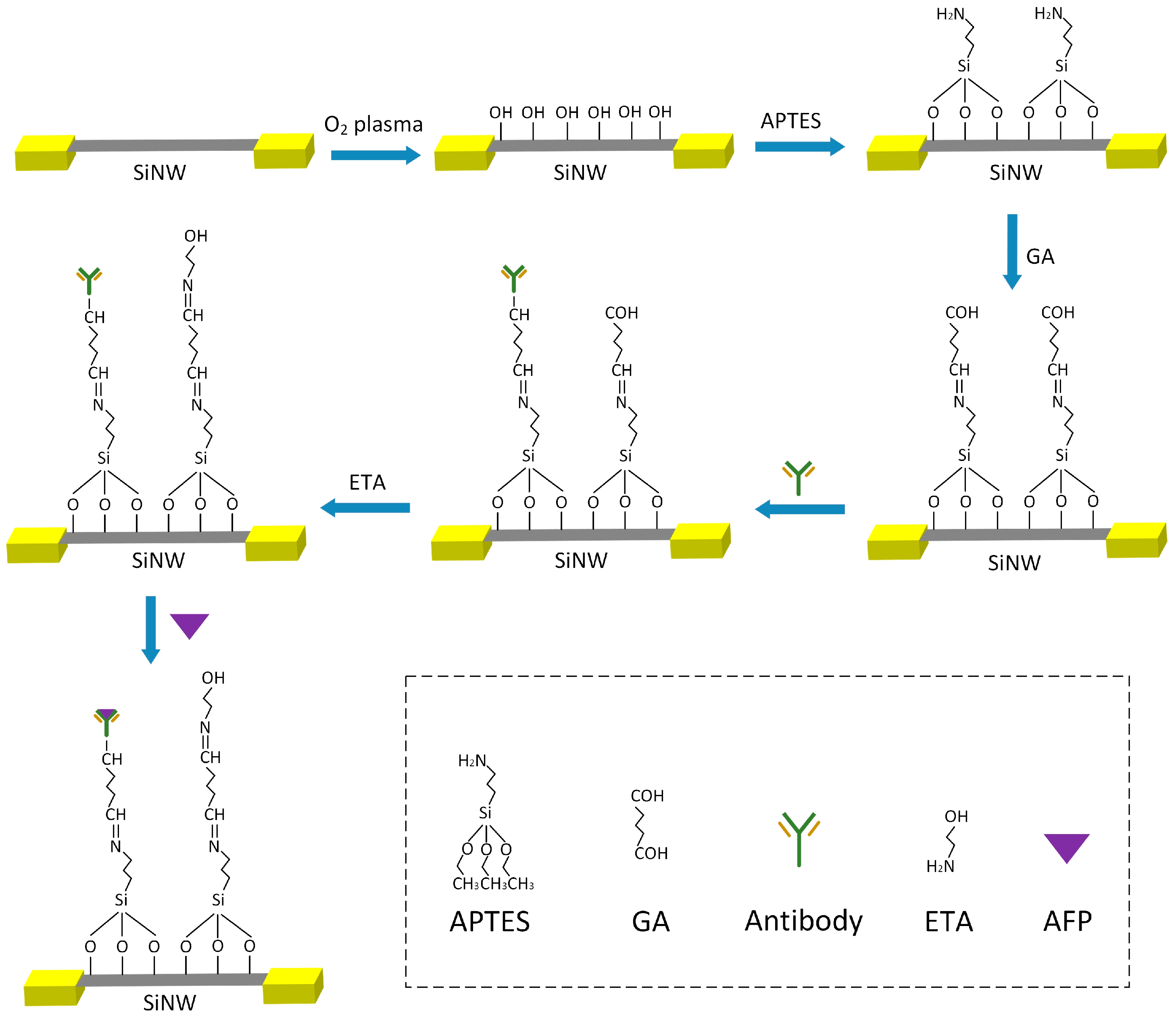 - Azmi, M.A.M.; Tehrani, Z.; Lewis, R.P.; Walker, K.A.D.; Jones, D.R.; Daniels, D.R.; Doak, S.H.; Guy, O.J. Highly sensitive covalently functionalised integrated silicon nanowire biosensor devices for detection of cancer risk biomarker. Biosens. Bioelectron. 2014, 52, 216–224. [Google Scholar] [CrossRef]
