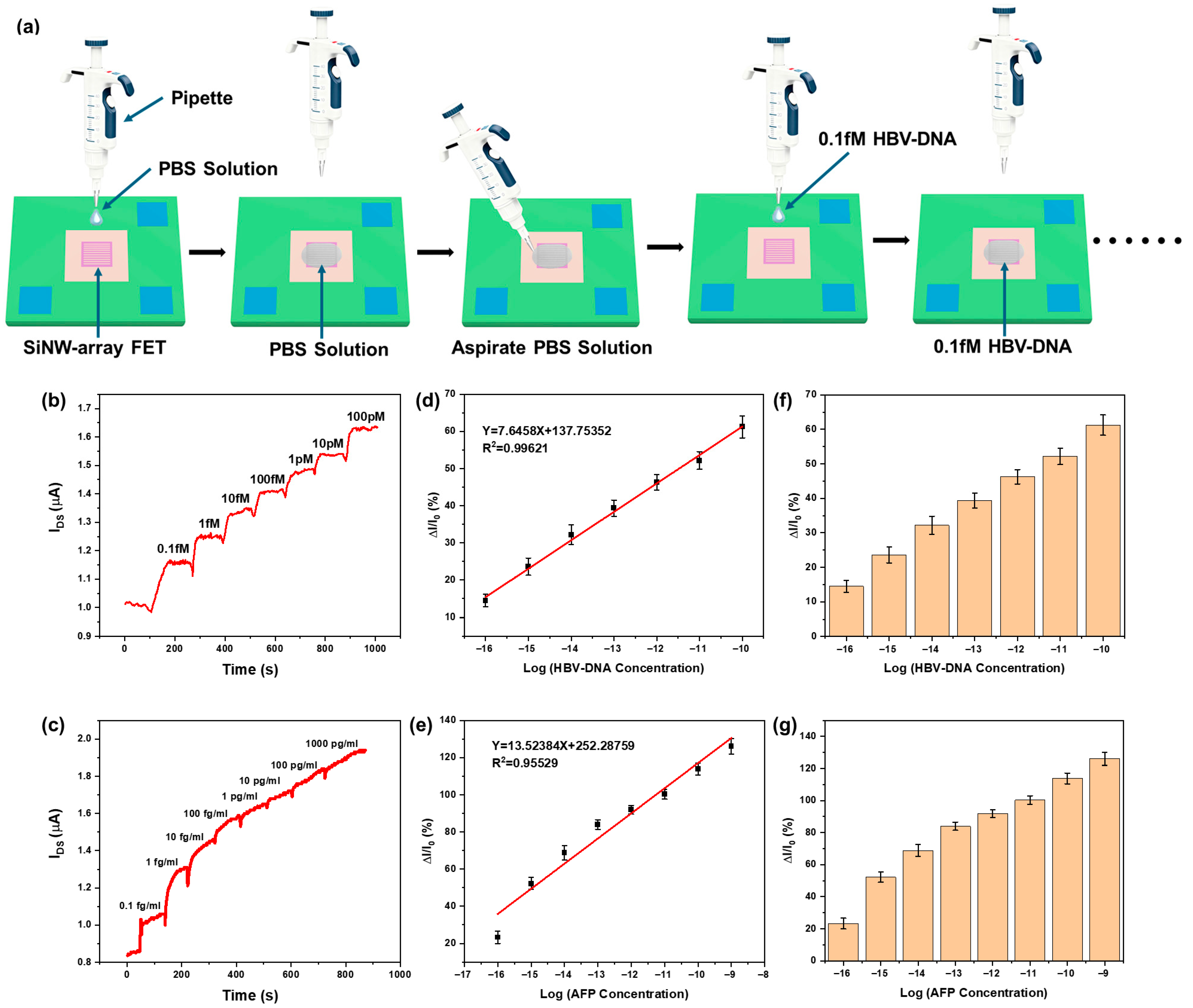 APA StyleSun, P., Liu, M., Zhang, Y., Liu, C., & Yang, X. (2025). A Highly Sensitive Silicon Nanowire Array Field Effect Transistor Biosensor for Detecting HBV-DNA and AFP. Sensors, 25(20), 6385. https://doi.org/10.3390/s25206385