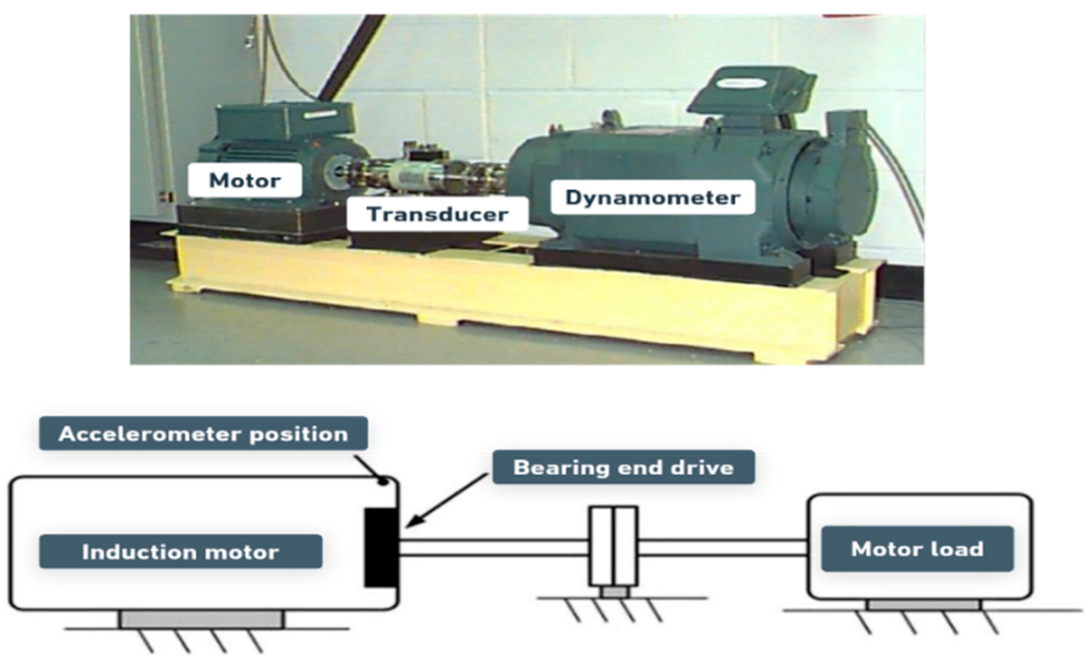 Figure 1 consists of an electric induction motor on one side, a torque transducer in the middle, and a dynamometer on the other end to simulate the load. The experimental data was obtained based on the accelerations generated by an electric motor under various conditions, including altering the nature of failure, severity, and the shaft rotational speed.
