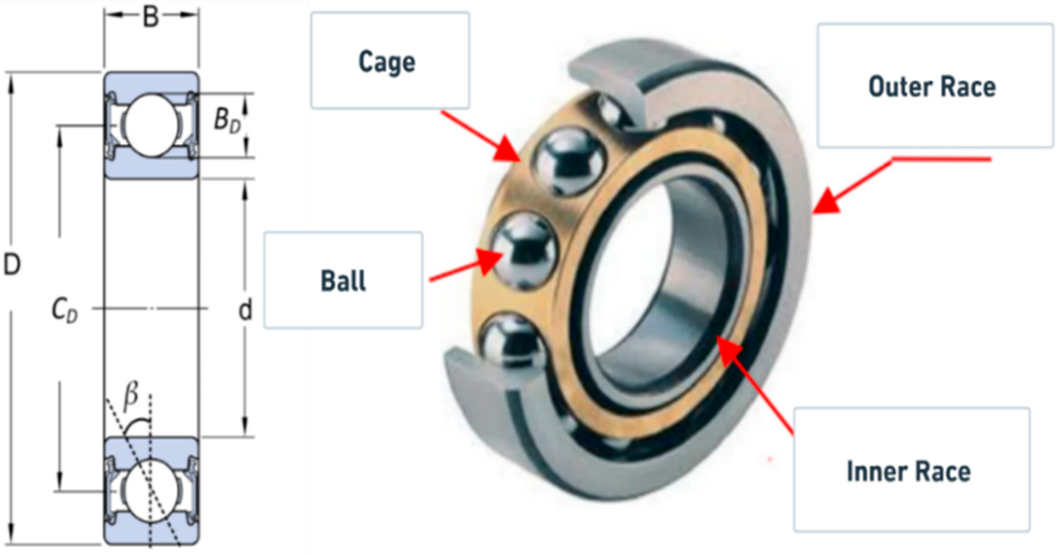The bearing used in this study is the SKF 6205-2RSL JEM single-row deep groove ball bearing, which consists of four main components: the inner race, outer race, ball, and cage. These components are illustrated in