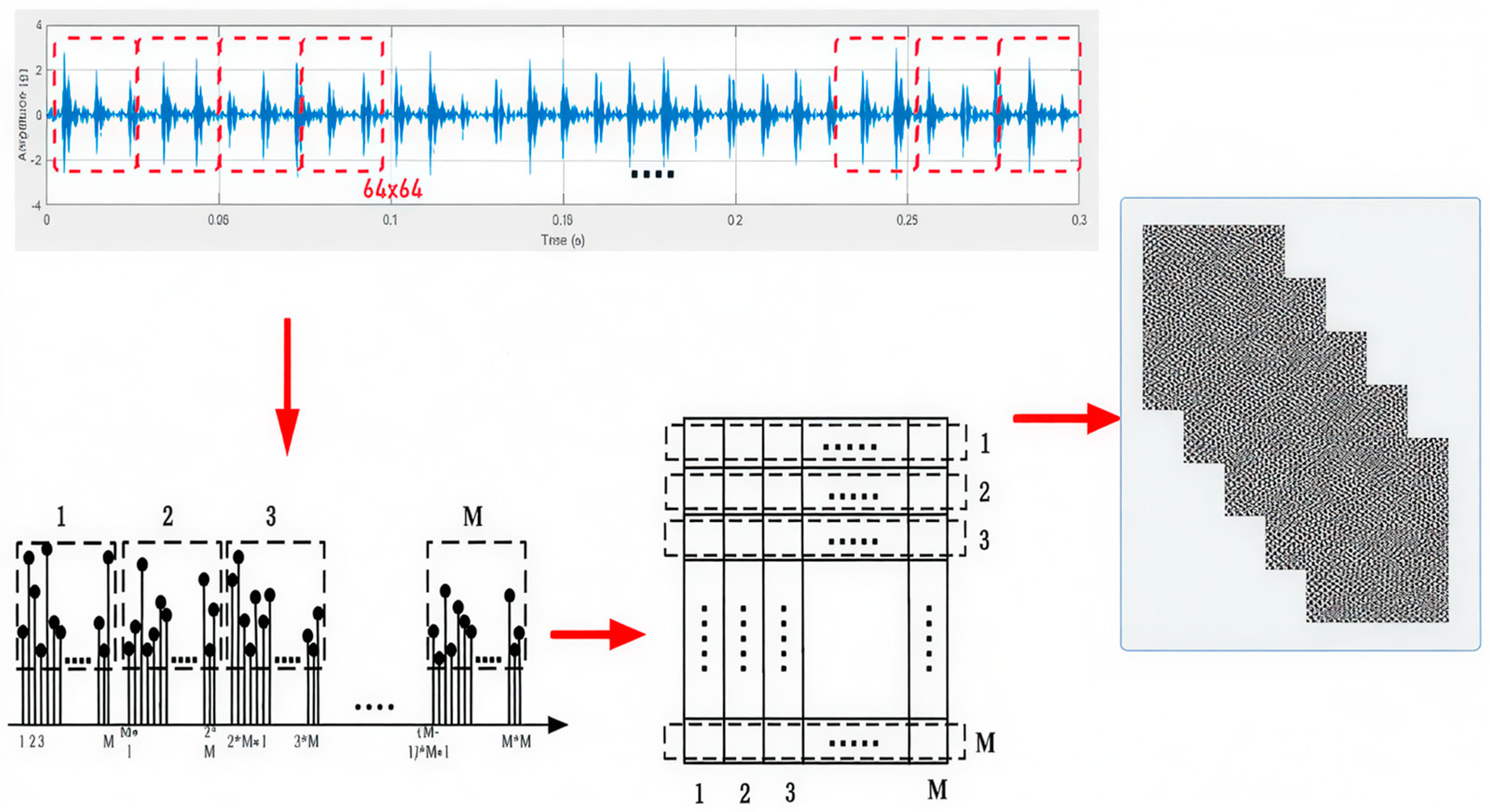 Figure 3, involves transforming raw time-domain signals into images, offering an alternative preprocessing approach. To create an M × M image, a segmented signal of length