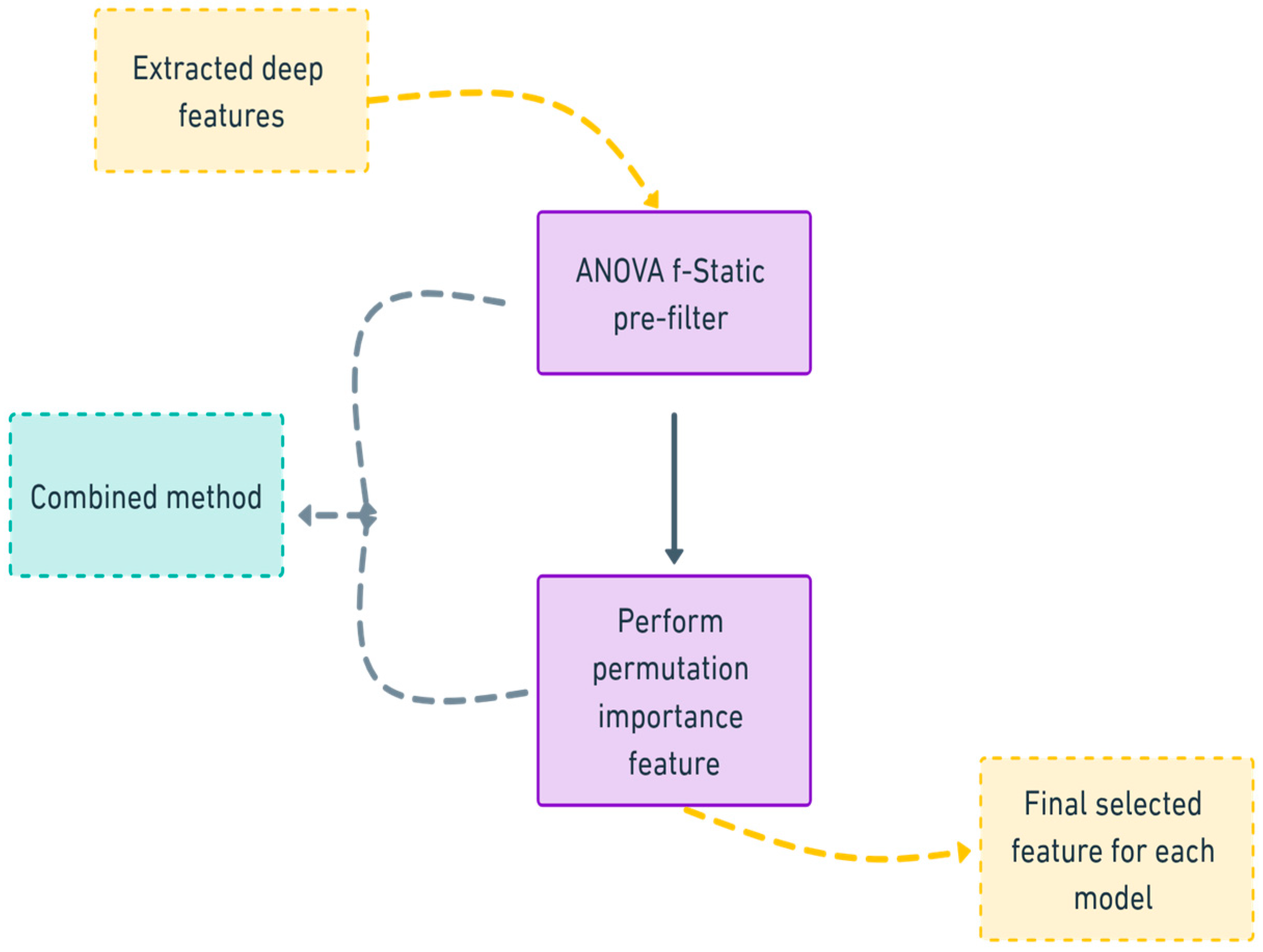 Following the extraction of deep features using the pre-trained VGG19, a two-stage feature selection strategy is employed to identify the most relevant and informative features for each classifier from deep extracted features. In the first stage, ANOVA is utilized to statistically rank all extracted features based on their ability to discriminate between fault classes. The top-ranked features are then selected to reduce dimensionality while retaining the most diagnostically significant information.