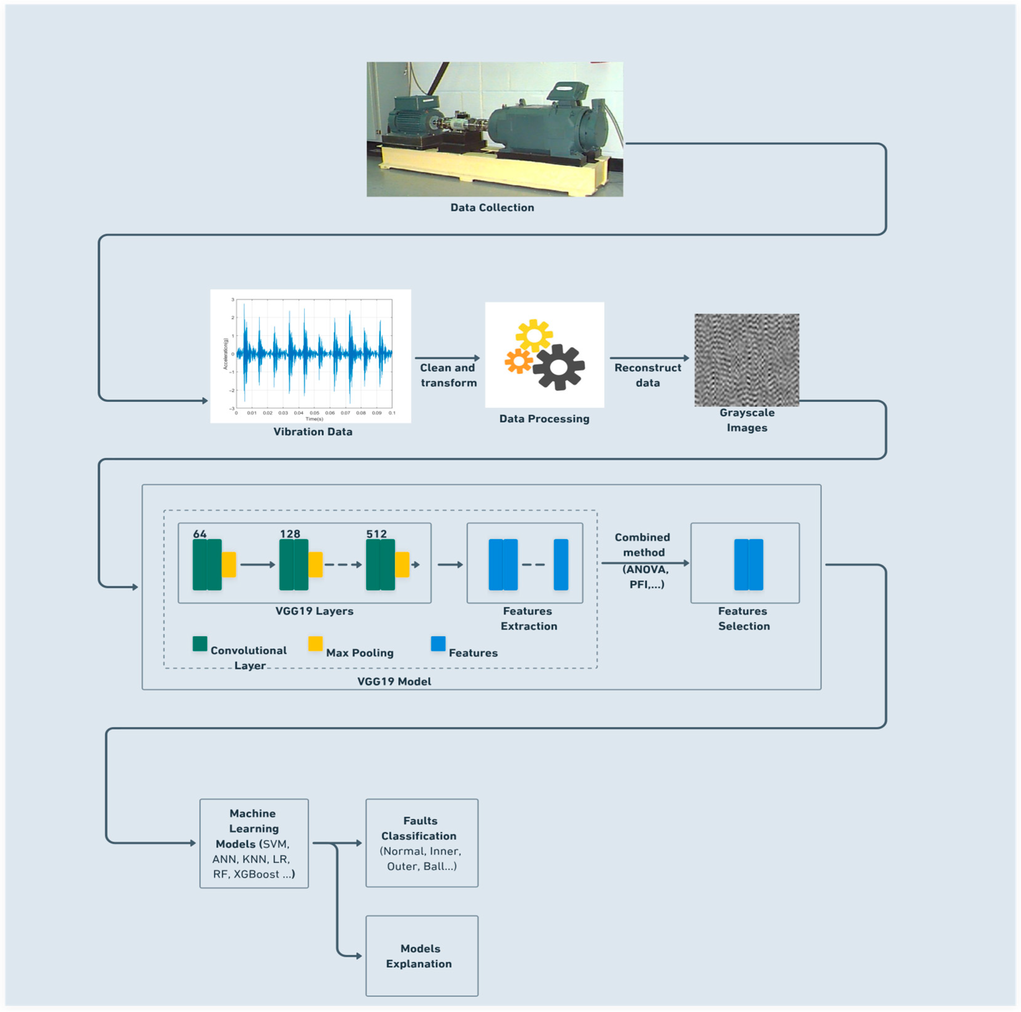 Within the first step, the vibration signal is converted to a 64 by 64 grayscale image. At first, the collected vibration signals are subjected to a data preprocessing process to prepare them for conversion. The process consists of removing errors from the raw data, eliminating duplicate data, and transferring the data type. The second step is about feature extraction. VGG19 extracts all deep features, generating 4096 features from the output of the first fully connected layer (fc1) of the pre-trained VGG19 model. The next move is more sensitive, the third step in our proposed strategy. It concerns feature selection. In this step, features are selected, employing the dual stage approach, to use them in a fourth move, involving classification utilizing various machine learning classifiers. The last step in our methodology workflow is dedicated to explaining the outcomes of the fourth step.
