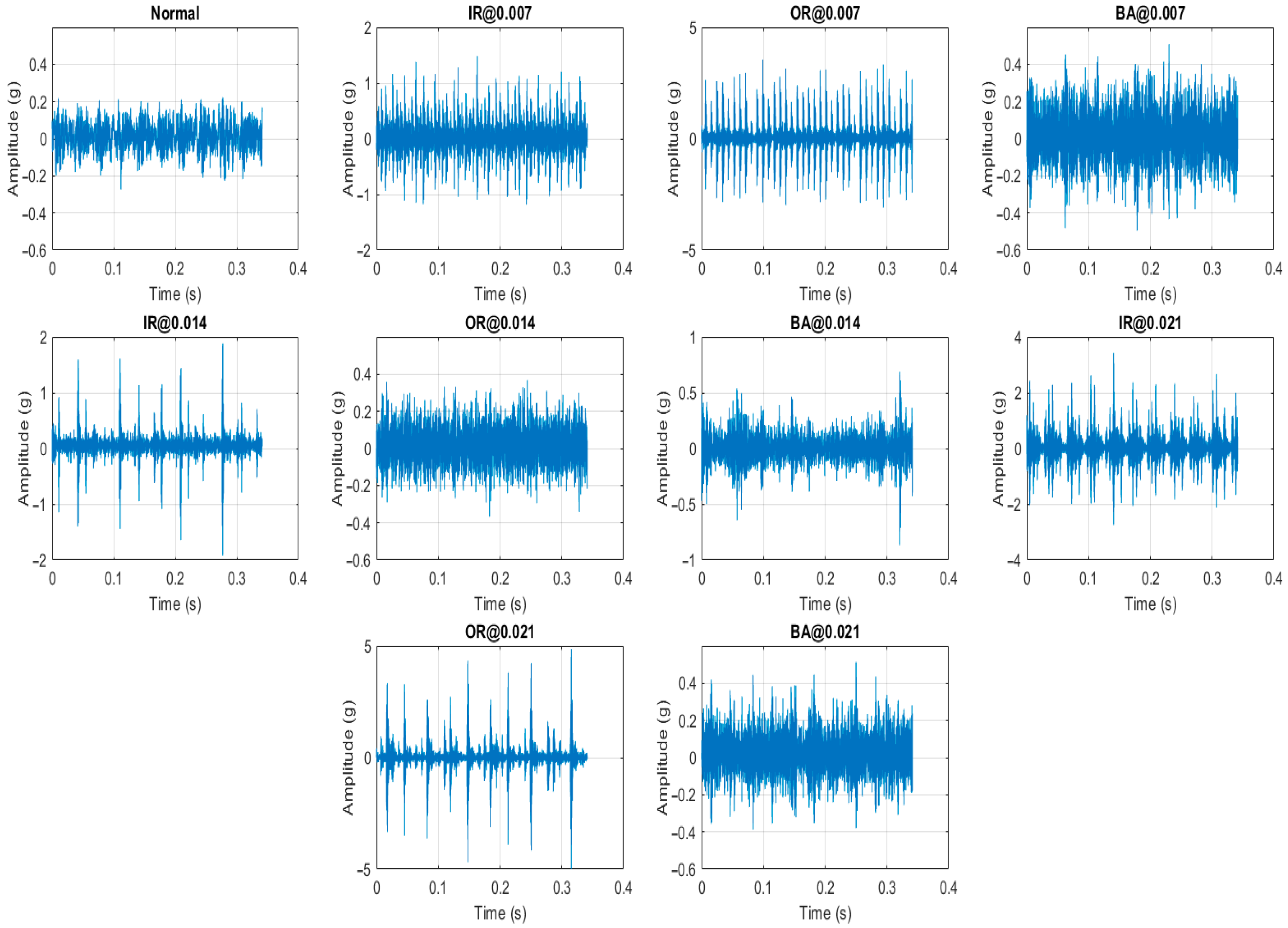 The vibration data were captured by an accelerometer fixed to the bearing housing at the drive end of the induction motor and collected under various conditions, including health operation, inner race fault, outer race fault, and ball fault, at different motor loads of 0, 1, 2, and 3 hp and for fault diameters of 0.007, 0.014 and 0.021 inches. The data are recorded at a sampling rate of 12,000 samples per second and saved in MATLAB format files. Samples of the vibration signals under the different operating conditions are shown in