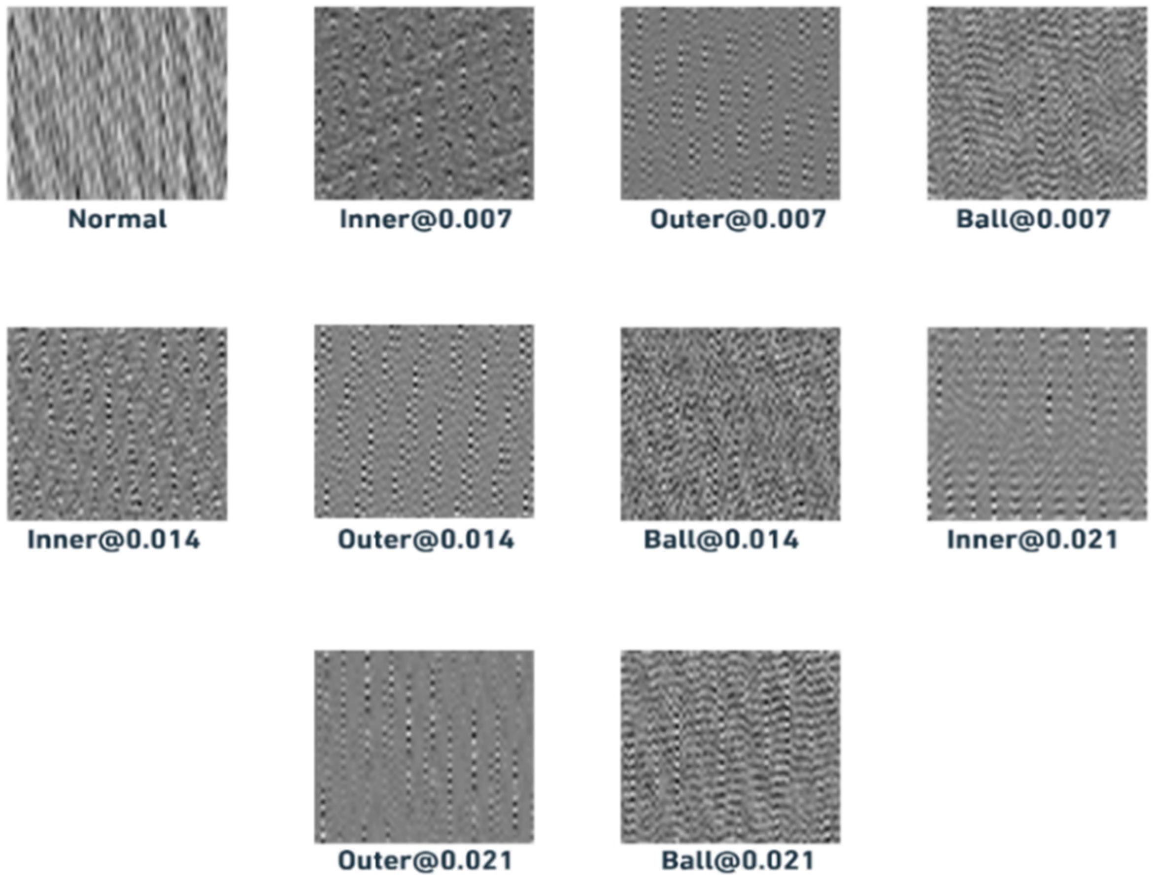 36]. This straightforward mapping converts 1D raw signals into 2D textured representations, where each operational condition whether normal or indicative of a bearing defect corresponds directly to a distinct class of similarly textured images. Notably, this approach does not rely on any predefined parameters, making it a flexible and effective preprocessing technique. The choice of this specific 1D to 2D conversion method over other alternatives, such as wavelet scalograms, was guided by its simplicity and computational efficiency. Unlike scalograms, which require careful selection of mother wavelets and scale parameters potentially introducing additional complexity and computational overhead the proposed method is parameter-free and preserves the temporal texture of the signal directly. This enables effective feature representation while allowing for direct application of image-based deep learning techniques, such as convolutional neural networks, without prior transformation design.