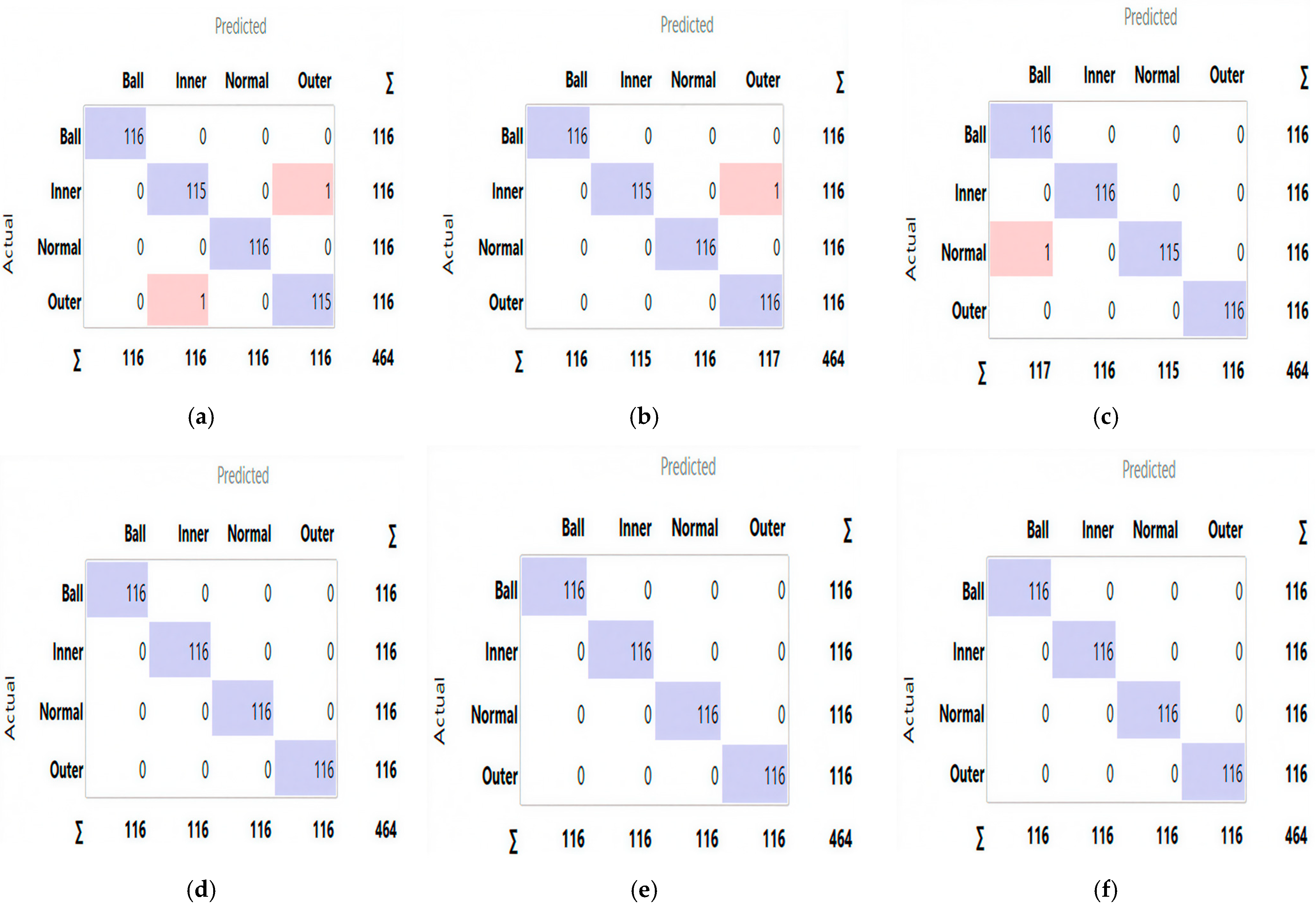 Importantly, these improvements extend beyond algorithmic performance to directly enhance defect identification in rolling bearings. The higher accuracies correspond to more reliable differentiation between normal conditions and specific fault types (inner race, outer race, and rolling element defects), while reduced computational time supports faster and more practical deployment in industrial settings. Thus, the proposed hybrid diagnostic framework not only surpasses traditional classifiers in numerical performance but also strengthens the quality of fault detection and enables timely, reliable diagnosis for predictive maintenance applications.