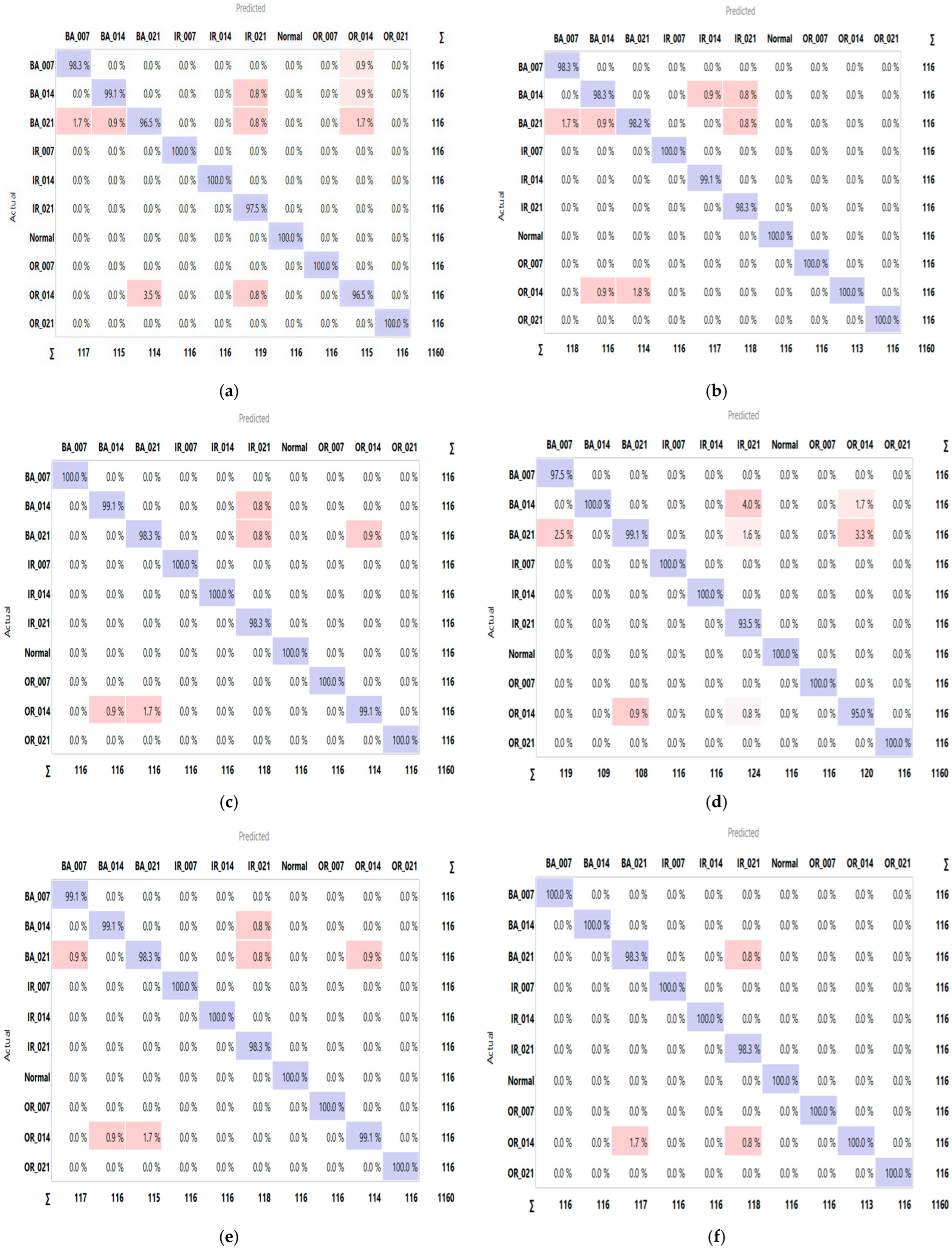 Table 6. The comprehensive analysis indicates a real improvement of all the machine learning models in classifying rolling bearing faults, adopting the workflows proposed in this study. Particularly, in terms of diagnostic accuracy and computational efficiency, the Support Vector Machine (SVM) algorithm exhibited superior performance achieving classification accuracies of 100% and 99.66%, with notably reduced computational times of 0.1 s and 6.8 s on Datasets A and B, respectively.