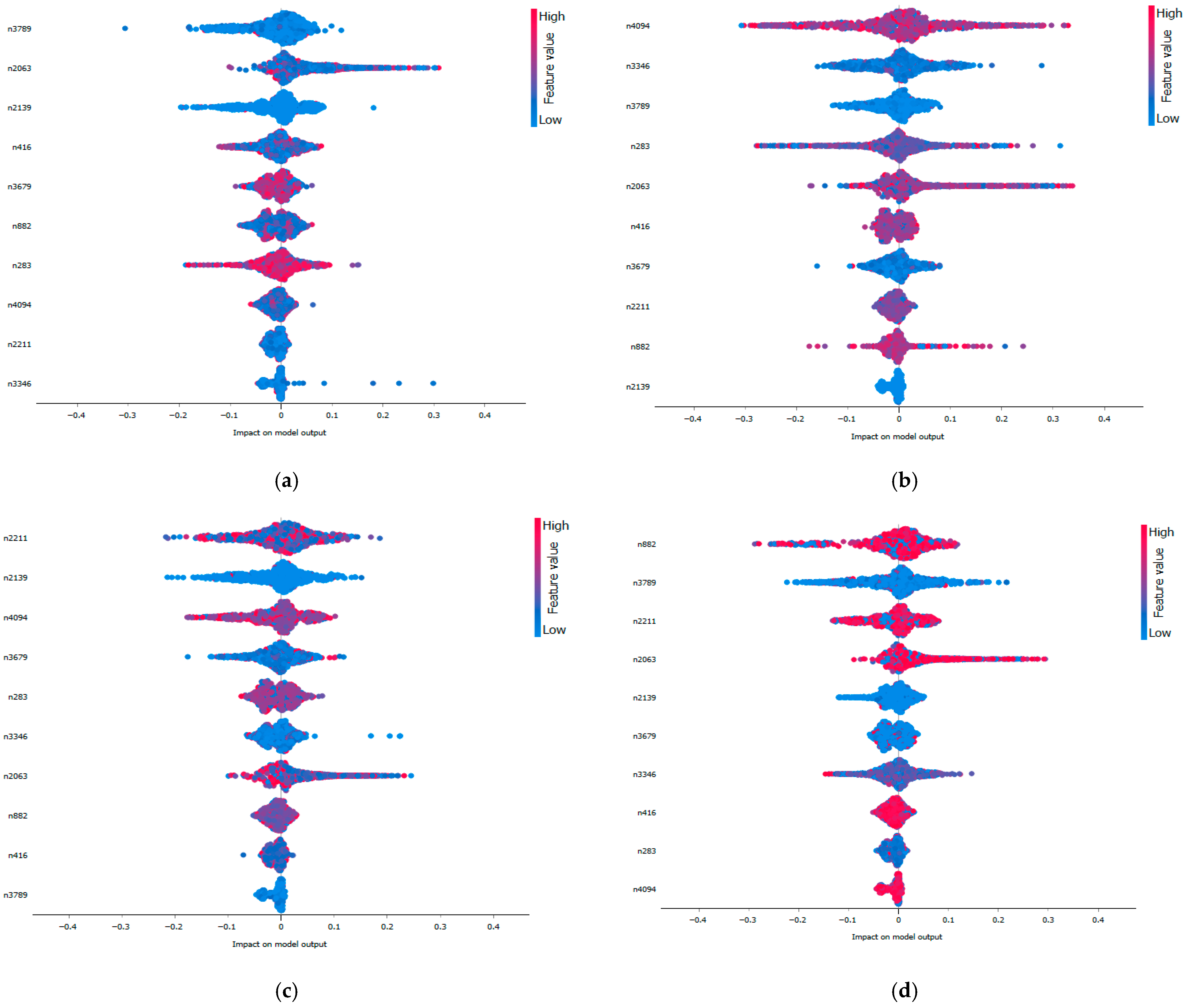 55]. Thus, SHAP not only complements PFI but enhances interpretability by revealing the direction and magnitude of each feature’s influence at the instance level.