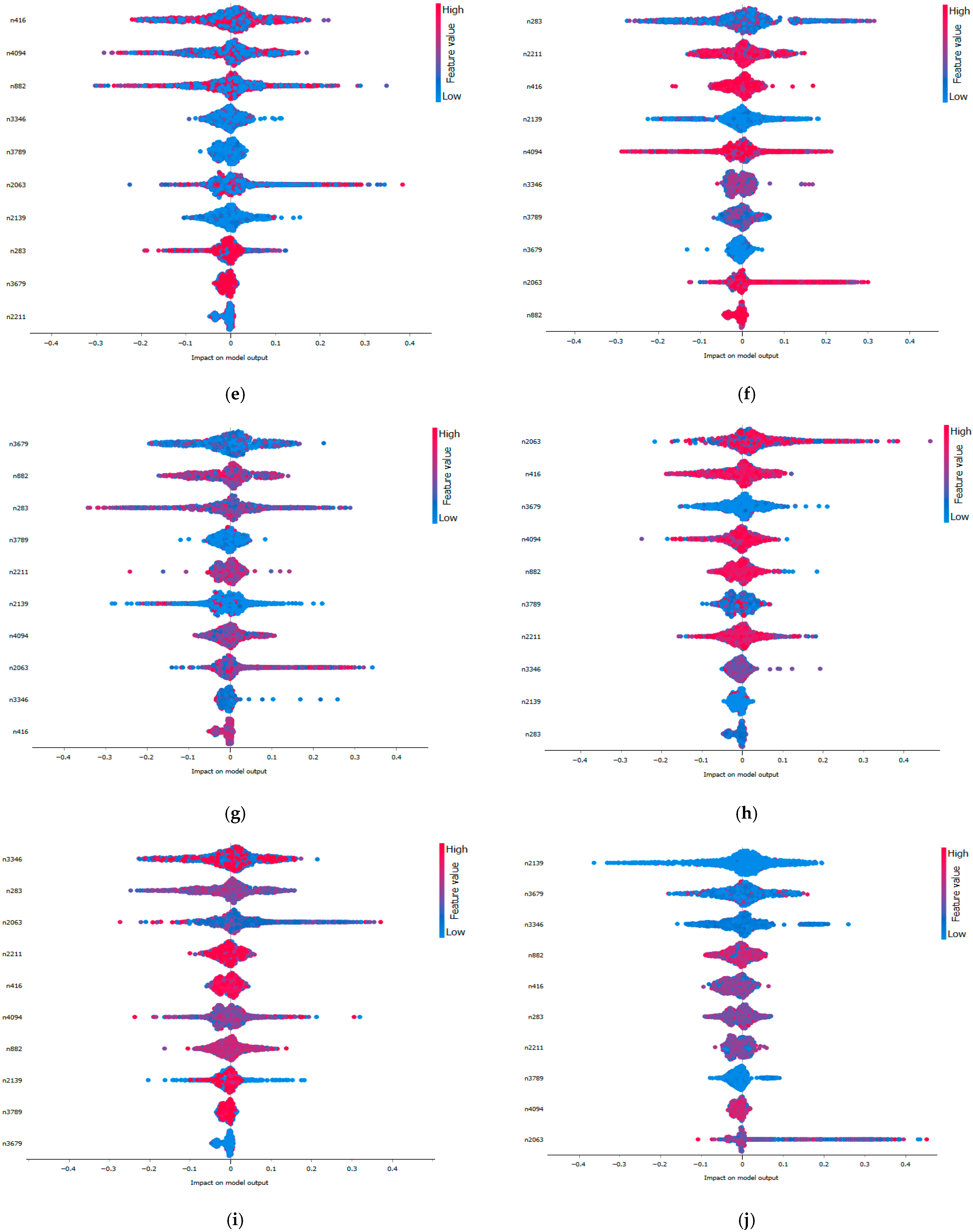 This visualization facilitates a clear understanding of the contribution of individual features to the model’s decision-making process. For example, a low value of feature n283 positively influences the prediction of fault classes IR_007, IR_014, and IR_021, while negatively impacting the classification of OR_007, OR_014, and OR_021. Conversely, a high value of feature n416 enhances the likelihood of predicting fault classes OR_007, OR_014, and OR_021, while exerting a negative effect on the prediction of IR_007, IR_014, and IR_021.