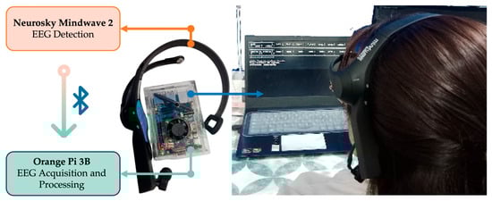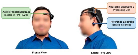 The system was built around the NeuroSky MindWave Mobile 2, a device recognized for its portability, low cost, and ease of use in non-invasive EEG acquisition applications [41]. It records brain electrical activity through a single frontal channel (FP1) and transmits the data wirelessly via Bluetooth. The selection of FP1 was not discretionary but determined by the design of the NeuroSky Mindwave device, which restricts acquisition to a frontal pole electrode.