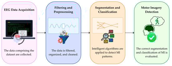 Building on the processing flow illustrated in Figure 3, the methodological stages can be organized into a structured sequence that consolidates the main steps of EEG data analysis. These stages encompass the transition from raw signal acquisition to filtering, feature extraction, and supervised classification, culminating in performance evaluation. This sequence, summarized in Table 3, ensures consistency and reproducibility in the detection of neural patterns associated with motor imagery of the lower limbs.