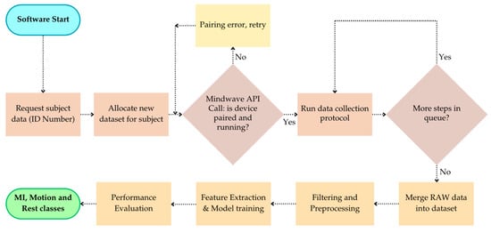 The detailed algorithm implementation, illustrated in Figure 3, begins with software initialization, followed by subject data entry (ID number) and dataset allocation. The system then performs a MindWave API call to verify device pairing and operation. In case of error, the process retries.