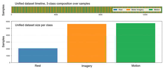 In total, 50 CSV files were generated (5 repetitions per subject × 10 participants). These files were subsequently merged into a consolidated dataset, as shown in Figure 6, structured into labeled segments corresponding to three task categories: rest, motor imagery, and motion. The target variable was coded in a supervised manner as Target ∈ {Rest = 0, Imagery = 1, Motion = 2}, ensuring reproducibility and traceability between experimental conditions and the corresponding EEG activity.