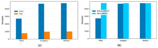 The consolidated dataset ultimately comprised 14,900 labeled samples. Each record was structured into 12 columns: 10 continuous features (δ, θ, low_α, high_α, low_β, high_β, low_γ, mid_γ, attention, and meditation), one target variable with three categories (Rest, Imagery, and Motion), and one block information column to group contiguous protocol segments. This organization ensured both traceability and consistency between experimental conditions and recorded brain activity.