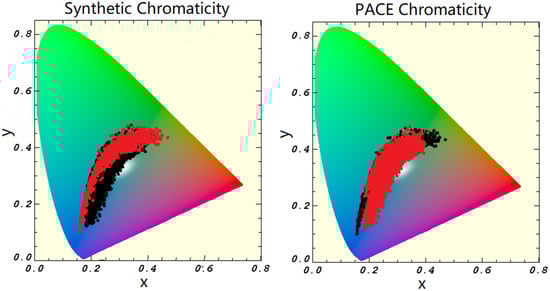 Colorimetry is the science of numerically quantifying color based on the spectral power distribution, , across the electromagnetic spectrum [11]. In this study, we apply colorimetric analysis to evaluate the spectral balance and coverage of our datasets within the visible range (400–700 nm). To do this, we rely on the CIE 1931 color space, developed by the International Commission on Illumination (CIE), which maps the visible spectrum to human color perception using standardized tristimulus functions [12,13]. These functions correspond to the human eye’s sensitivity to red, green, and blue light, respectively. While the foundational principles of colorimetry have remained largely unchanged, recent work has continued to refine color difference metrics and extend colorimetric analysis into modern domains such as hyperspectral imaging and remote sensing [14,15,16]. These advances support more perceptually accurate comparisons and improved visualization techniques, particularly when evaluating high-dimensional spectral data. A recent study highlighted the usefulness in using chromaticity indices over a unified spectral range to distinguish algal bloom waters from normal waters, underscoring the importance of knowing the chromaticity space of a remote-sensed dataset [17].