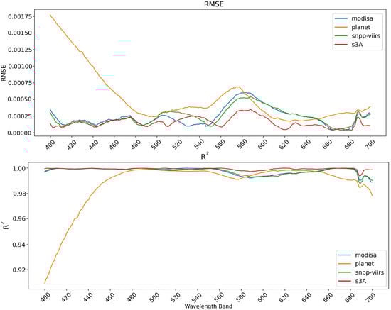 Examination of the RMSE and per wavelength band shown in Figure 2 demonstrates that the error for the 3-band model (PlanetScope) greatly exceeds that of the other models when the wavelength is below 490 nm. This is expected as this model has no informative bands below that point. Aside from this, the 3-band model performs closely with the other models, meaning the majority of the decrease in the and increase in RMSE are attributed to these lower bands. All models experienced an uptick in error between 560 and 500 nm, which is the largest gap in bands in the multispectral sources, as well as near 690 nm. The 690 nm band is not far from nearby bands for many of the multispectral sensors, indicating that this difference is likely a consistent issue in the training data that the models have picked up.