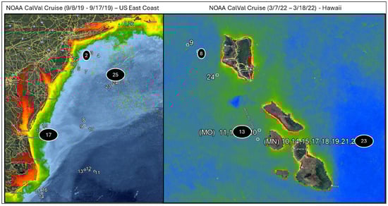 The overall aim of the annual NOAA calibration and validation cruises is to support improvements in the extent and accuracy of satellite remotely sensed ocean color parameters in the near surface ocean by collecting high quality in situ optical and biogeochemical data for validating satellite ocean color radiometry and derived products from NOAA JPSS VIIRS and additional Navy operational ocean color satellites. The in situ data collected during the NOAA calibration and validation cruises used in this study were collected using the Spectral Evolution Incorporated’s PSR-1100F hyperspectral spectroradiometer on the bow of NOAA’s Research Vessels. The cruises selected for examination were the 2019 cruise off the United States East Coast and the 2022 cruise in Hawaii. The New England cruise ranged from 8–17 September 2019, which consisted of a total of 26 stations, and is representative of coastal and shelf waters. The Hawaii cruise ranged from 7–18 March 2022 with 16 station locations and captures a more stable blue water environment near the ocean color satellite standard calibration and validation site MOBY. The stations for each cruise are shown in Figure 3.