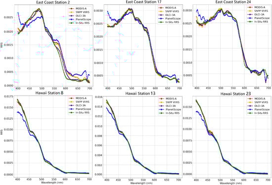 Figure 4 shows the collected at three of the stations for each cruise to demonstrate the differences in the true hyperspectral values at each point and the hyperspectral predictions made by the four models. As seen in this figure, the majority of the models fit closely to the true hyperspectral curve, with the PlanetScope 3-band model falling off trend below 500 nm due to its lack of spectral bands below 490 nm. In this figure, the Hawaii cruise samples appear to be near-perfect fits at wavlengths above 490 nm even for the PlanetScope model, while there is more variation in the East Coast predictions. In this case, the and SMAPE are impacted heavily due to the uniformity of the Hawaii dataset because a simple prediction of the mean value for all points would outperform the models’ estimates. Additionally, the RMSE is impacted by the scale of the data since the East Coast data has a maximum value of 0.003 , while the Hawaii data ranges as high as 0.0175 , meaning the Hawaii data can have larger estimates in error simply due to the scale of the data. This highlights the limitations of relying solely on the performance measures of individual datasets to assess model performance under different environmental conditions. Examining performance of the models in a variety of oceanic contexts is important, as the ocean presents a wide range of optical properties each of which leads to a different spectral response.