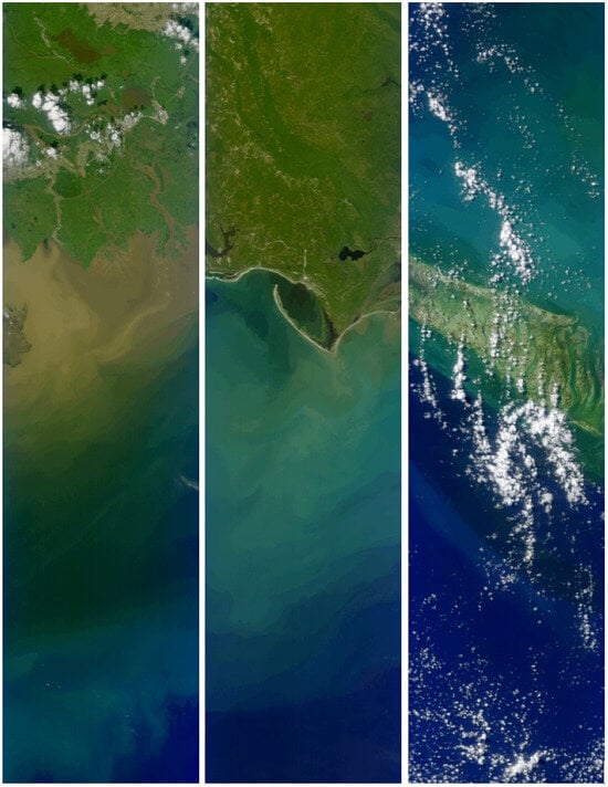 - NASA Ocean Biology Processing Group. OceanColor Web. NASA Ocean Biology Distributed Active Archive Center. Available online: https://oceancolor.gsfc.nasa.gov/ (accessed on 13 August 2025).