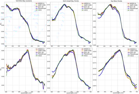The HICO scenes were sized at (512, 2000). Land and cloudy pixels were omitted from the evaluation, leading to 278,269 pixels to predict for Vermillion Bay, 290,107 for Saint Joseph Bay, and 422,440 for the Key West scene. The models showed a general trend of predicting each scene in roughly 5 min, with time increasing slightly from the 3-band PlanetScope model to the 11-band OLCI model as shown in Table 2. The metrics achieved on each of the scenes, given in Table 3, reflect an overall increase in accuracy with the increase in bands and appear to remain fairly consistent despite the changes in ocean-color distributions across the scenes. Most of the models achieve an of over 0.99, with the exception being the PlanetScope 3-band model achieving closer to 0.95. Overall, the fit of each hyperspectral curve shown in Figure 6 also reflects this increase in accuracy for the models with increased bands, with most of PlanetScope’s inaccuracy again occurring below the 490 nm band.