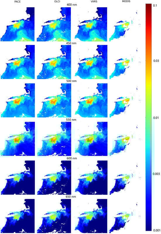 To test the applicability of the hyperspectralization approach on raw sensor data, a scene off the coast of Rhode Island was selected, with coincident data gathered from MODIS, SNPP VIIRS, OLCI 3A, and PACE OCI. Despite differences in overpass times, spatial resolutions, and levels of cloud and sun glint contamination, the hyperspectralization models performed well across all sensors. Specifically, the Rhode Island scene was captured at 14:53 UTC by OLCI, 16:16 UTC by SNPP VIIRS, 17:45 UTC by PACE OCI, and 18:00 UTC by MODIS. While the core scene features remained largely consistent during this window (as shown in Figure 7), data quality varied—MODIS, for instance, was significantly affected by sun glint later in the day, whereas OLCI and VIIRS had clearer observations closer to the PACE OCI overpass.
