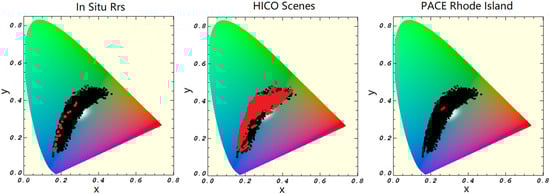 Here we compare the covered chromaticity space for the validation sets versus the training set. The in situ dataset is depicted to the right, HICO in the middle, then in the far right image is the PACE OCI Rhode Island scene. The chromaticity space of each validation dataset is displayed in red and overlaid on the full training data space (black).