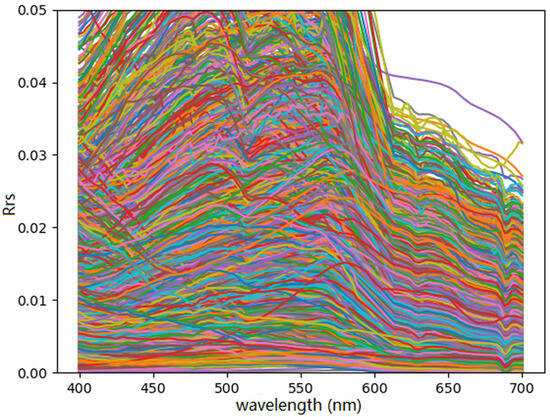 The spectra used in training for the combined synthetic and PACE OCI dataset was plotted as a collection of hyperspectral curves with varying colors to enhance visibility.