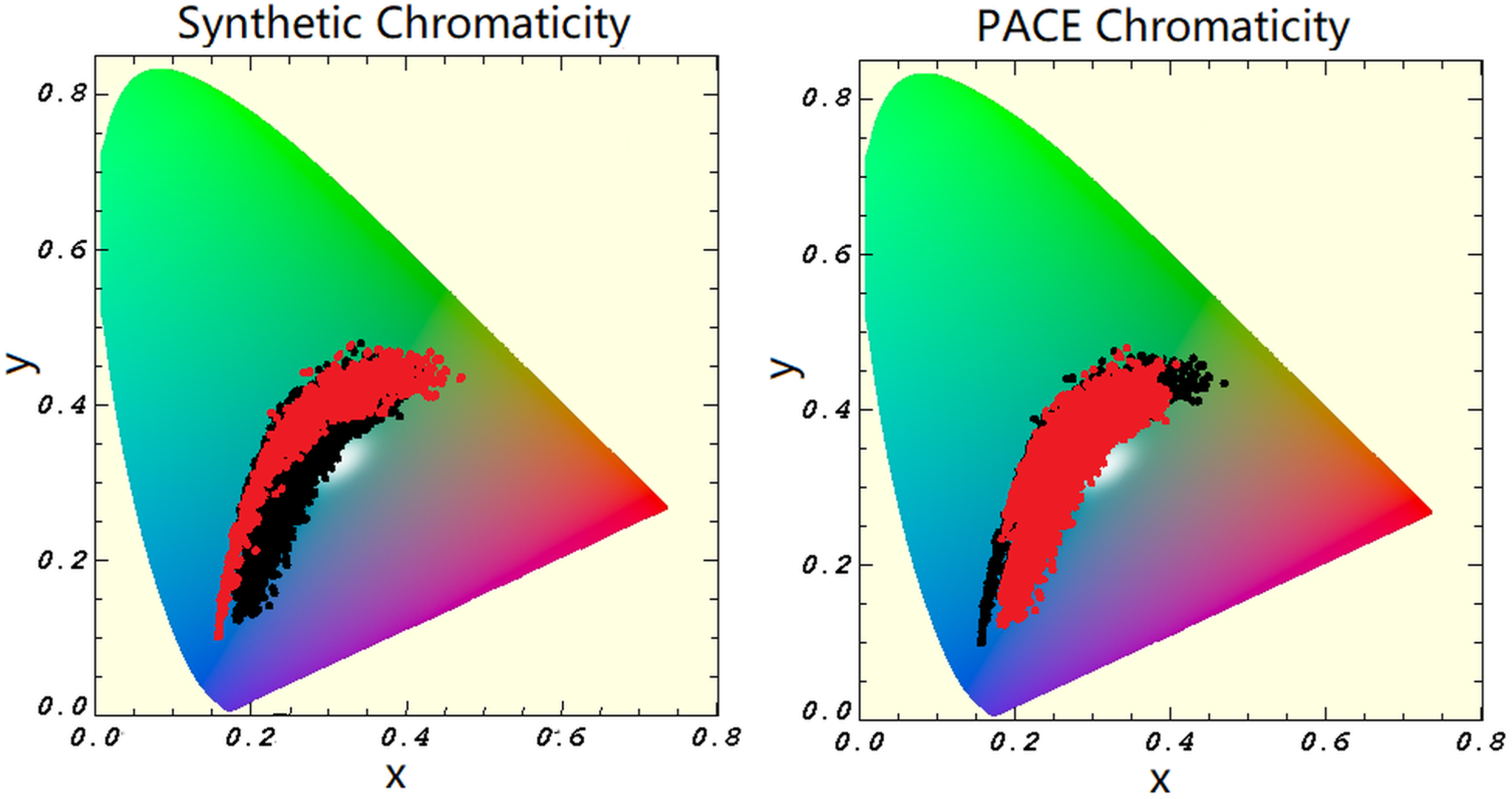Figure 1). Plotting ocean color data in chromaticity space serves as a quality control tool, helping to identify underrepresented regions of the color spectrum. For example, the synthetic dataset includes a broader range of blue and green waters, while the PACE OCI dataset captures more mixed-color waters with red–green–blue blends. By combining both datasets, we achieve more comprehensive chromaticity coverage, improving the training base for color reconstruction models.
